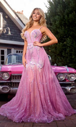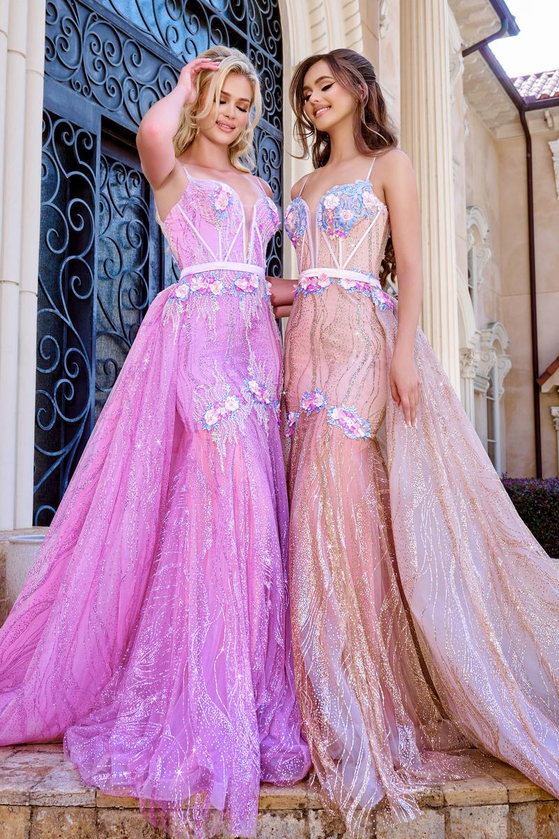 PS24251, will captivate everyone's eyes, grab yours now at Terry Costa! This Portia and Scarlett gown is from Spring 2024 collection is perfect for Prom night. The fit and flare silhouette is created with enchanting two-toned glitter fabric. A corset top with plunge that will accentuate your waist and garnished with beautiful floral detail. The gown is completed with a stunning overskirt that will sway with every step that you take! For additional details on this gown, give us call at Terry Costa or Chat with us!