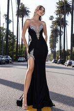 The moment you step into the room, this Portia and Scarlett gown does the talking first. The fitted silhouette in rich stretch satin molds to your curves, while the strapless v-neckline frames your collarbone in a way that feels both red carpet and royal. Rhinestone accents glitter along the corset bodice, sculpting your waist and giving that goddess energy that looks like it came straight out of a music video. Every move catches the light, so the whole look reads sexy, glamorous, and effortlessly popular without you saying a word.From the hips, the skirt flows into a smooth, liquid finish before opening into a daring slit that shows off your legs and your heels with confident flair. A sweeping train trails behind, adding drama to every turn and making staircases and hallways feel like your personal runway. The modest back keeps everything balanced and refined, so the sparkle and shape stay chic instead of over the top. Perfect for Prom 2026, this gown is pure showstopping beauty, made for the girl who wants to feel like a regal goddess and the star everyone remembers.