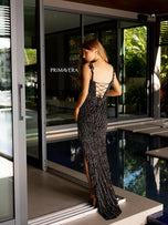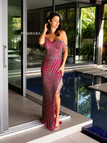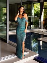 Become your own fashion icon in this long evening gown by Primavera from Spring 2024. 4127, will have you shimmering all night long with allover sequins and fun fringe details! The form fitting gown displays an elegant off-shoulder neckline with cap sleeves, corset back for a snatched waist. The fitted skirt is completed with slit and fringe detail.