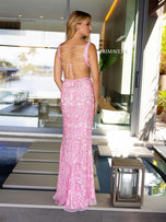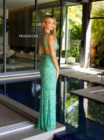 This Primavera on-trend prom dress will have all eyes on you when you walk in! 4175, showcases a v-neckline with thick beaded straps that lead to an eye-catching open back. This beauty is fully adorned in sparkling sequins from top to bottom. A slim fitting silhouette is completed with a side leg slit.