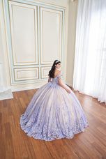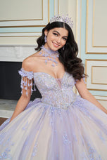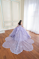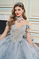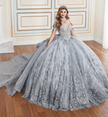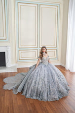 Make an unforgettable entrance in this captivating Quinceaera gown. Featuring exquisite three-dimensional floral appliques, sparkling stone accents, and shimmering beadwork, this showstopping ball gown radiates elegance. The semi-sheer illusion sweetheart neckline and elegant draped sleeves add a touch of glamor, while the breathtaking detachable scalloped train ensures all eyes will be on you. Want to switch up your party style? Simply add the pretty matching caplet and enjoy two looks in one!