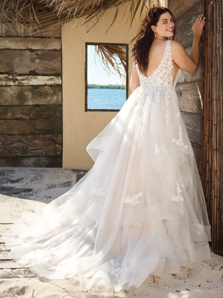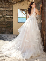 Rebecca Ingram by Maggie Sottero Designs Dress 23RK688A01 is a romantic, bohemian dress perfect for any destination or beach wedding. Its A-line skirt features playful ruffled layers with cascading tiers of tulle, elegantly adorned with beaded lace appliques and 3D flower appliques on the bodice. The deep V back neckline is accented with covered buttons down the back while the plunging illusion V-neckline in the front is complimented with illusion pleated details on the bodice. The hem is finished off with exquisite horsehair trim to make this dress simply stunning. The gown is also available with a lined bodice for the bride who prefers a more modest look. Shop here at Terry Costa for beautiful bridal gowns that won't break the bank.