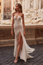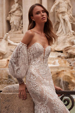 Sherri Hill's Style 71132 is a breathtaking symphony of lace and daring elegance. Sunlight dances on an illusion corset bodice, whispering secrets in delicate threads. A high slit peeks beneath the cascading skirt, adding a touch of modern adventure. The back stuns with a low open design, inviting whispers of romance, while detachable illusion lace balloon sleeves offer a whimsical touch you can choose to wear or flaunt. The mermaid silhouette sculpts your form before giving way to a chapel train, a moonlit symphony of lace trailing behind you. This isn't just a dress; it's a feeling, a twirl under the stars, a love story waiting to be written. Slip into Style 71132 and become the queen of your own enchanting fairytale.