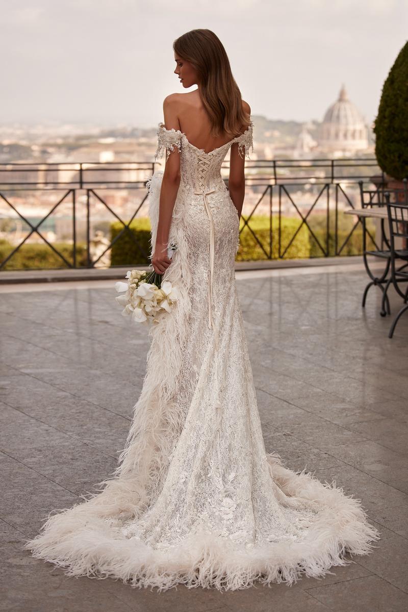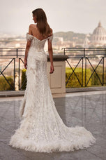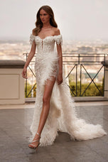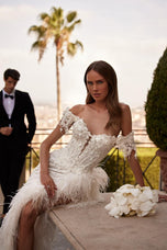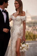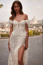 Elevate your bridal style with Sherri Hill 81096, a stunning and seductive strapless off-shoulder lace bridal gown designed to turn heads. The dramatic thigh-high slit adds a touch of allure to this Hollywood-inspired masterpiece, while the sparkling lace detailing ensures you shimmer with every step. The tie-up back adds a fun and fashion-forward element to your wedding ensemble, allowing you to customize the fit to perfection. With playful feather detailing, this gown is perfect for brides dreaming of a flirty and chic beach wedding or an outdoor celebration. Embrace your inner starlet with Sherri Hill 81096 and make a statement on your special day.