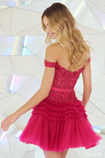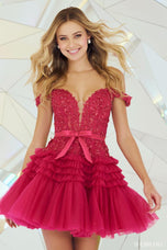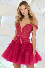 Sherri Hill style 55680 is made of sugar and spice and everything NICE! The stunning short dress features a dropped waist with satin bow detail over full ruffle tulle skirt. The sheer bodice covered in floral lace appliques, giving the homecoming dress a tiny touch of sultry! Paired perfectly with the sweet satin bow and ruffled sparkle tulle skirt, this Sherri Hill homecoming dress is duality at its finest. You're going to ~ EAT ~ in the perfect combo of sweet and sexy that is Sherri Hill style 55680!