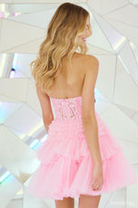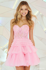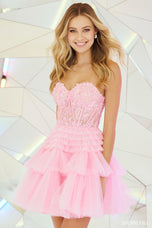 RUN, this is NOT a drill - Sherri Hill style 55683 is everything we dreamed of and MORE! The perfect homecoming dress features a strapless sweetheart neckline, sheer corset bodice, and full ruffle tulle skirt. The bodice is embellished with a classic floral lace and enhanced by just enough sequins to see some sparkle. The ruffle tulle skirt is a cult favorite long, and we expect nothing less from the fabulous short version! You can pair this dress with a fun heel or opt for a more practical sneaker, either way you're going to slay this look at hoco 2023! Dress runs small. Please call us for sizing help.