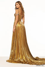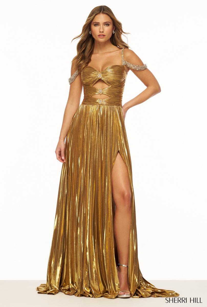 The metallic trend is here to stay for Prom 2024! We love this metallic prom dress by Sherri Hill! Sherri Hill 56187 has a fitted bodice with cut outs detailed with rhinestones and off the shoulder straps. The A-line skirt on this long prom dress is constructed with gorgeous pleating! The high slit completes this metallic pleated evening dress! So, throw on those nude heels and dance the night away at prom, homecoming and more!