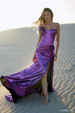 Practically made for the red carpet, Sherri Hill style 56839 is the epitome of glamour! The fitted metallic gown features a strapless neckline, corset bodice with dropped waist, and fitted skirt with a slit. The ruching details at both the waistline and the back zipper are incredibly flattering, while the boning in the bodice snatches your waistline. The most stunning part of this gown, though, is the chic rosette details at the neckline and hip, which is the most perfect finishing touch for the sweeping side train. You'll feel sophisticated and sexy in this striking Sherri Hill corset gown at your upcoming formal, gala, or red carpet appearance!