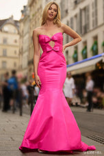 Attention Ladies! Sherri Hill 56875 is the IT dress for you! With a classic mermaid design- perfect for spinning the night away- and statement strapless bodice, we like to think this dress is reminiscent of Marie from the classic film The Aristocats. With a ruched bodice, the most perfectly shaped bows, and a sweetheart cat eye neckline, this dress exudes fun, flirty, and classy. The subtle shine from the crystal embellished bows is the detail that elevates this dress to a whole new level. Whether you like to dance or not- you will find it hard to resist twirling all night long in this dress. For the ladies that like to keep it classy, but still have fun- this design is for you.