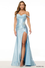 Get ready to serve looks, make memories, and own the night at Prom 2025 in Sherri Hill prom dress 57037! Cowl Neck + Corset + Peek a Boo Bodice = Serving! Sherri Hill is renowned for her fit and we know this silhouette will hug all your curves for an effortless fit. The fitted off the shoulder corset bodice is accented with a subtle lace peek a boo bodice detail. The corset midriff with side lace applique detail pairs perfectly with the lace bodice accents. The long dress with slit hugs all those curves. This look is finished with a slight train!