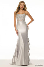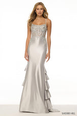 Let your search for the perfect prom dress come to an end because Sherri Hill has you covered with this stunning fitted dress from Spring 2025 collection. 57189, is designed to hug your curves perfectly. The corset top is adorned with delicate and beautiful lace details that cascade onto the side skirt, a lace-up back for a snug fitting, and ruffle embellished skirt in the back. Perfect for senior prom to black-tie formal.