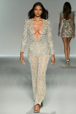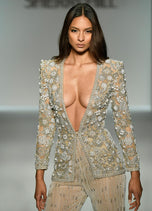 Have all eyes on you when you step foot into the room showcasing this impeccable two-piece pantsuit. 67047, is a Sherri Hill creation from 2025 collection. The entire attire features floral-like bead pattern with elegant pearls, the pants compliment the pattern from the linear beading. This is piece is one you don't want to miss out on!