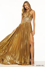 Category is... Bring it to the runway! Sherri Hill did just that when she showcased 56195 in New York Fashion Week! Of course she got tens across the board! Pleated Metallics are here to stay! This gown features a criss cross neckline, a high slit, and a beaded waistband. This gown serves from front to back with criss cross straps and flowy pleated skirt. Shine in this metallic at your next Prom, Gala, or Formal Event!