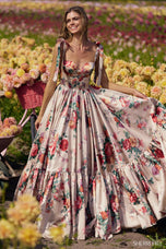 Embrace the cottagecore aesthetic at prom 2024 in Sherri Hill style 56285! The champagne floral print satin ball gown features a sweetheart neckline over full skirt. The details are everything and this Sherri Hill prom dress is effortlessly embellished with feminine ribbon bow straps and oversized ruffle detail on the full skirt. Satisfy your champagne taste in this stunning champagne floral ball gown prom dress by Sherri Hill at your upcoming prom, formal, or black-tie event!