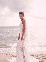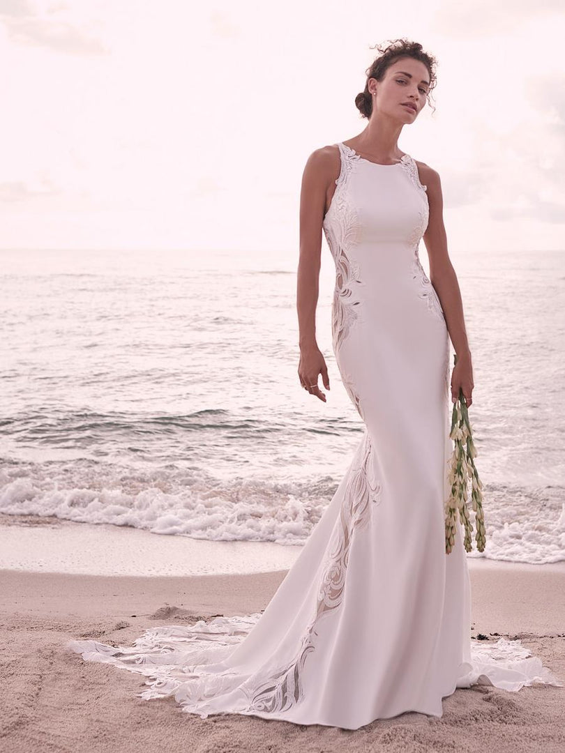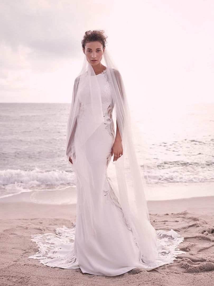 This is for the version of this style with this style # 21SC431B01There may be photos of multiple versions of this style pictured. Please check with us for details about the different variations.Aldora crepe; Modest scoop neckline; Modest scoop back with lined lace illusion along the neckline; Long illusion lace sleeves; Lined with Virtue stretch jersey for comfort; Zipper with covered buttons trailing to the hem; Illusion lace scalloped train; Detachable cap-sleeve lining for modesty included; Photographed in Ivory (gown with Natural Illusion); Detachable long sleeve lining for modesty sold separately; Available sleeveless with illusion lace side cutouts (Davis, 21SC431A01)