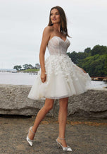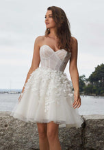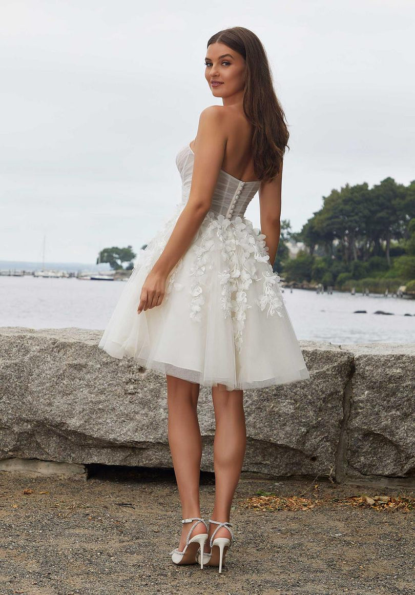 Our Naomi designer wedding dress embraces whimsical design. The short flared A-line features a sheer sweetheart bodice with couture corsetry and asymmetrical draping. The flounced tulle skirt has cascading three-dimensional floral embroidery for a fairytale look. Shown in Ivory/Prosecco/Honey.