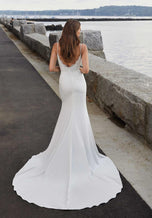 Sexy, yet sweet, our Nysa designer wedding dress is a curve-hugging soft satin fit and flare with romantic lace details. The slinky gown features a draped cowl neckline and open back with delicate lace edging that adds a feminine touch. The front skirt slit and more movement to the dress and reveals a sultry pop leg, with more lace to soften the look. Shown in Ivory.