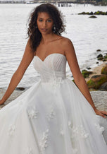 Our Nalani designer wedding dress is a breathtaking ball gown full of whimsy. The boned sweetheart bodice features asymmetrical draping with three-dimensional floral accents that float down the dress. The airy tulle has an effortless look and we love the playful addition of the detachable floral off-the-shoulder sleeves. Shown in Ivory/Honey.