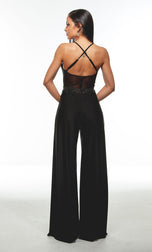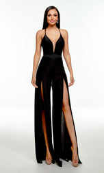 Give off two looks in one gown! The Alyce Paris by The Secret Dress, style 1696, showcases a plunging v neckline with thin straps. The jersey jumpsuit is finished with front leg slit pants.