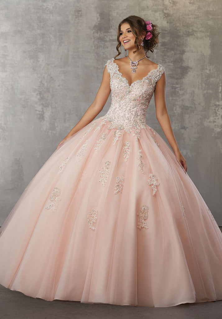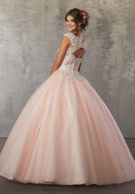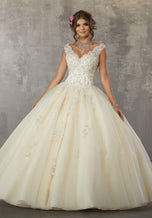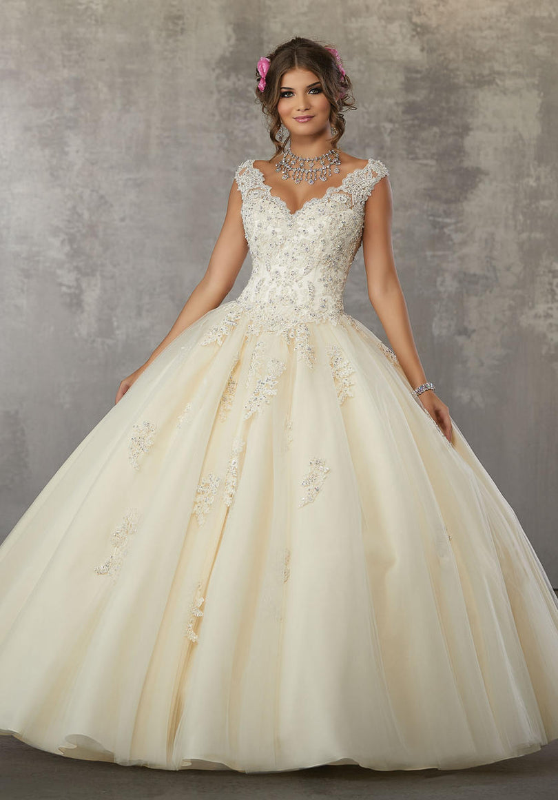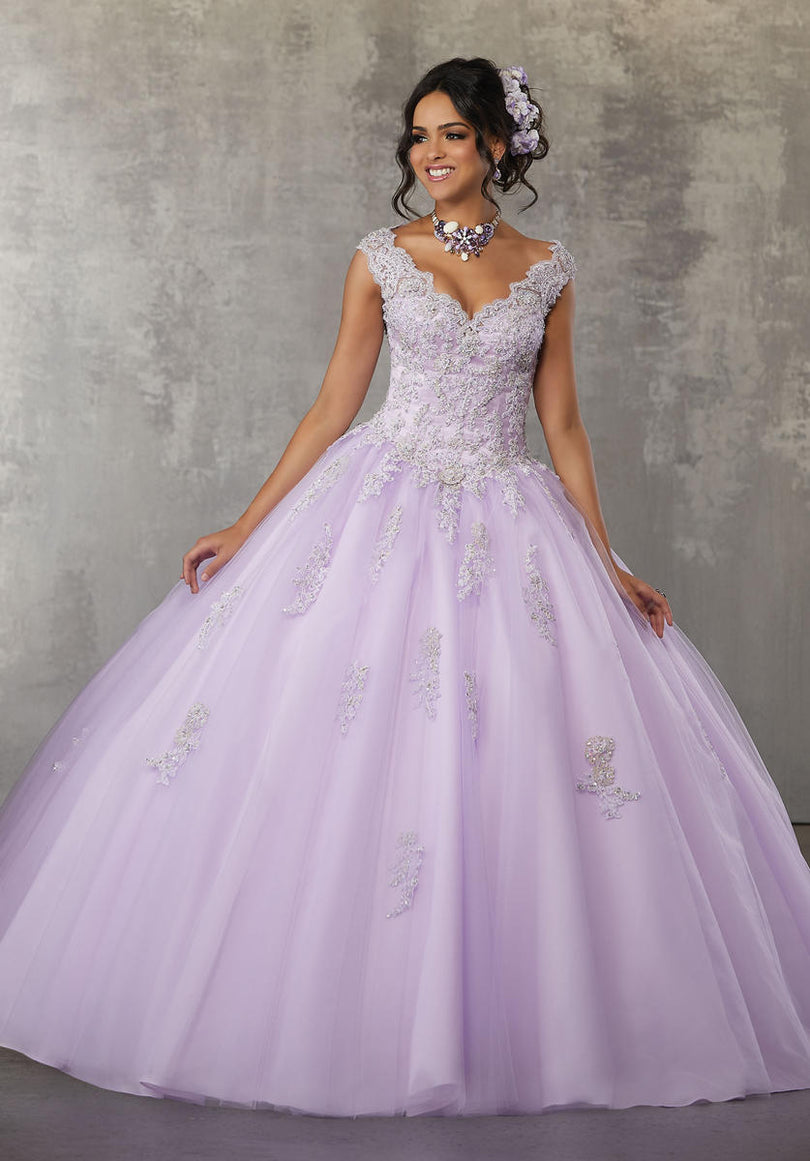 Make lasting memories in this beautiful ball gown style by the designer Valencia. Style 60033 features a V-neckline, semi cap sleeves, beaded lace applique bodice, tulle skirt with the appliques scattered throughout, and a corset tie back. Matching bolero jacket included.