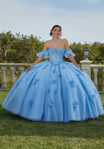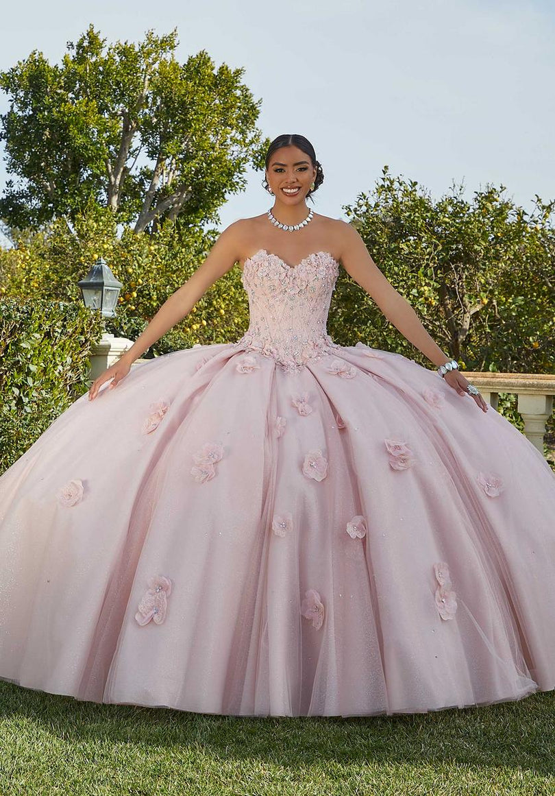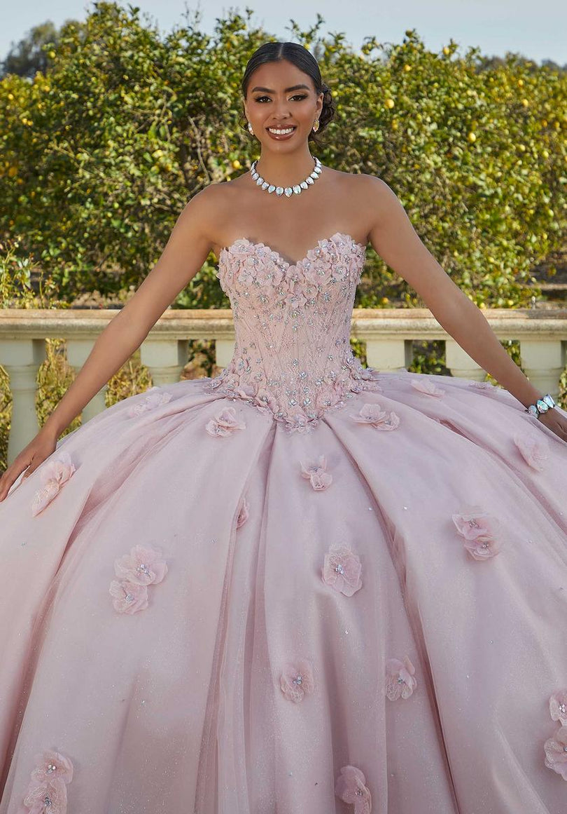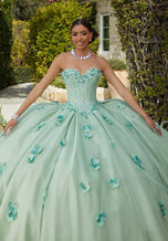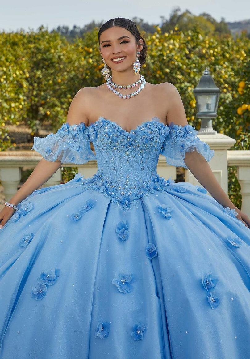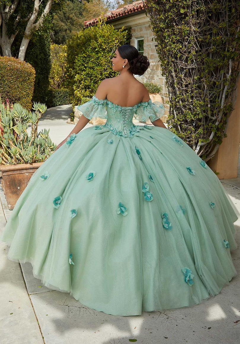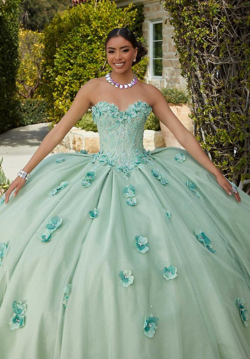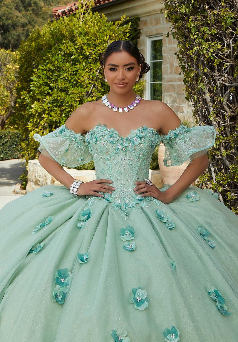 Luxe quinceanera ball gown features a Chantilly lace corset bodice with gorgeous crystal beaded three-dimensional floral appliques accenting the sweetheart neckline and basque waistline. The flowers float down the sparkling glitter tulle skirt while detachable off-the-shoulder sleeves add a touch of whimsy. Shown in Sage, Blush, and Bahama Blue.