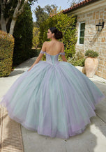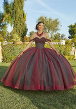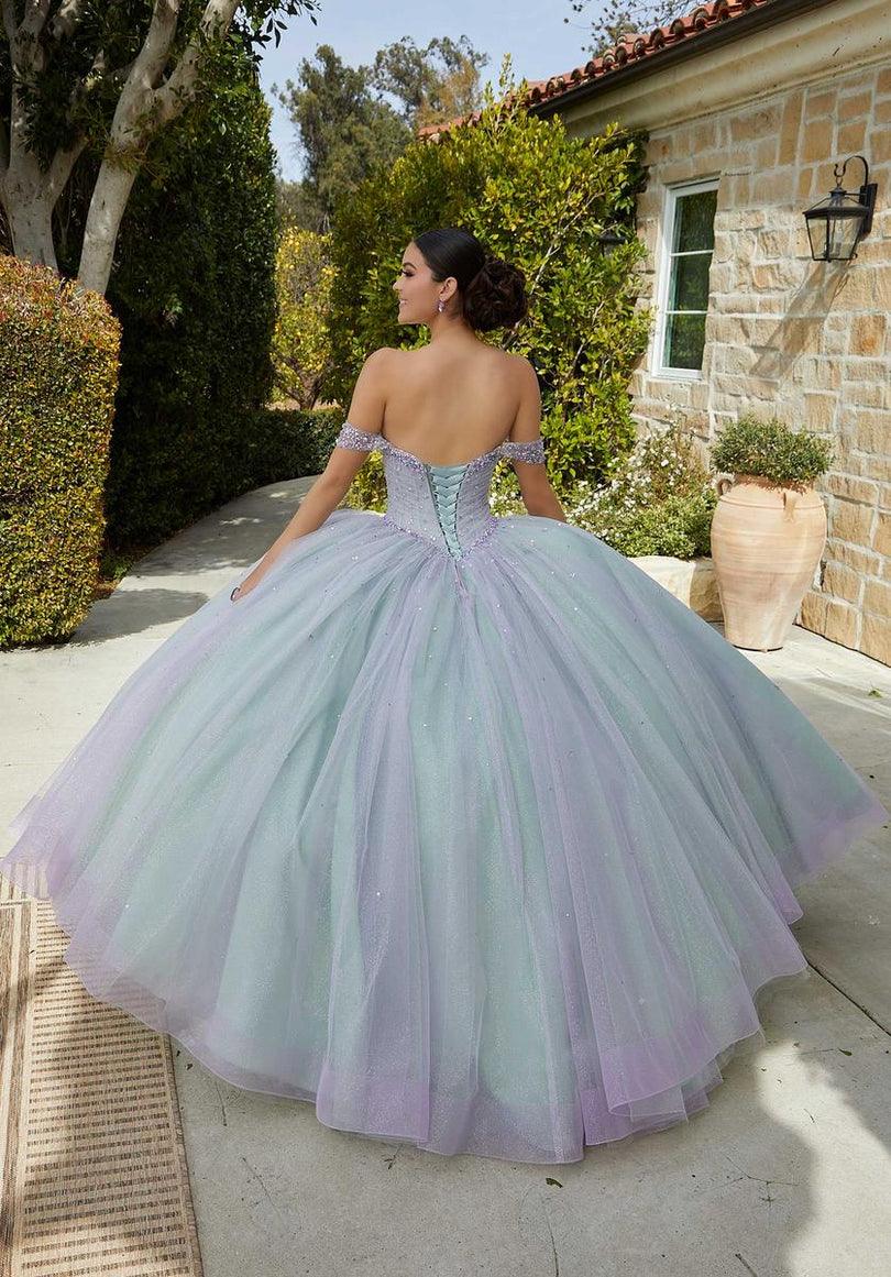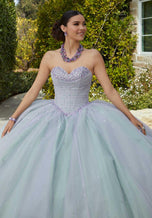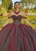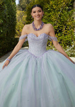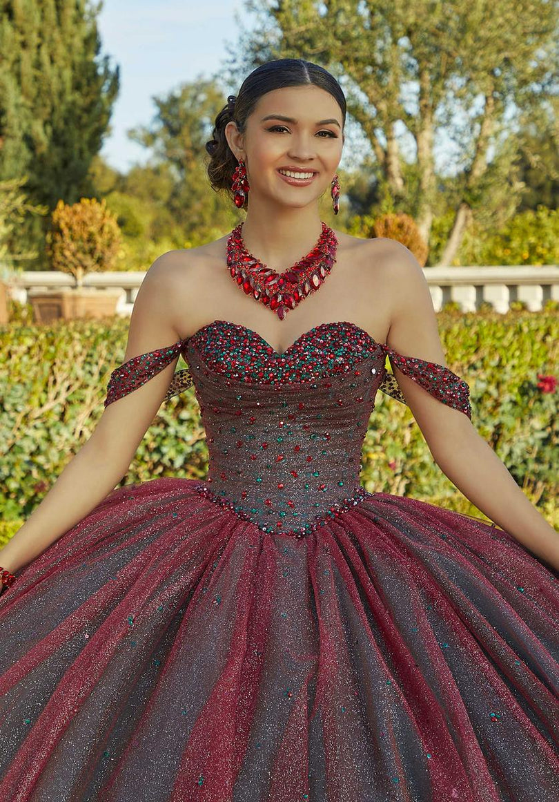 Shimmering quinceanera ball gown has a jewel-encrusted sweetheart neckline on a draped glitter tulle bodice that meets up with a beaded waistline and twinkling glitter tulle skirt. Detachable, beaded off-the-shoulder sleeves add another level of sparkle. Matching Stole included. Shown in Sangria/Emerald and Sage/Orchid.