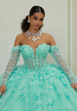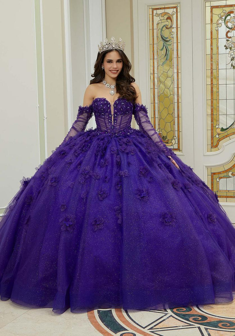 Morilee Style 60203 is a glamorous Quinceaera ball gown that exudes sophistication. The sheer bodice, featuring chic textured ruching and a plunging neckline, creates a striking silhouette. The dress is adorned with whimsical crystal-beaded, three-dimensional floral lace appliqus that add a touch of romance. The detachable ruched long sleeves, also embellished with lace appliqus, offer versatility. A lace-up corset back ties into a sweet bow, completing the bodice's allure. The sparkle tulle skirt adds a dazzling touch, while the matching stole provides an elegant finishing touch. This gown is perfect for the Quinceaera who desires a bold and glamorous look!
