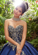 Show off on your special night in the Vizcaya Quinceanera by Morilee style 89241 ball gown! Look stunning in the strapless sweetheart neckline quinceanera ball gown! The beautiful bodice is detailed in metallic lace with gleaming crystal beading on top. You will get an adjusted fit with the stunning corset lace-up back. Feel stunning with the satin asymmetrical overlay that has lace details. This dress comes with detachable off the shoulder sleeves, beaded spaghetti straps and a matching stole. Find your dream dress at Terry Costa!