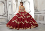 Have all eyes on you when you make your grand entrance in this bold Quinceanera ball gown by Morilee Vizcaya. 89324, is featuring blingy crystal beading on contrasting lace appliques from v-neck bodice down to the tiered, tulle over glitter tulle skirt with lovely, scalloped edging. Perfect for a Royal Theme party!
