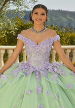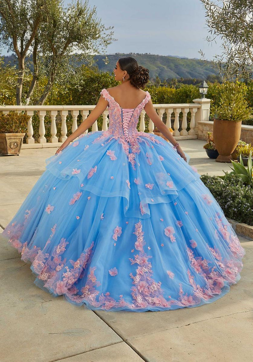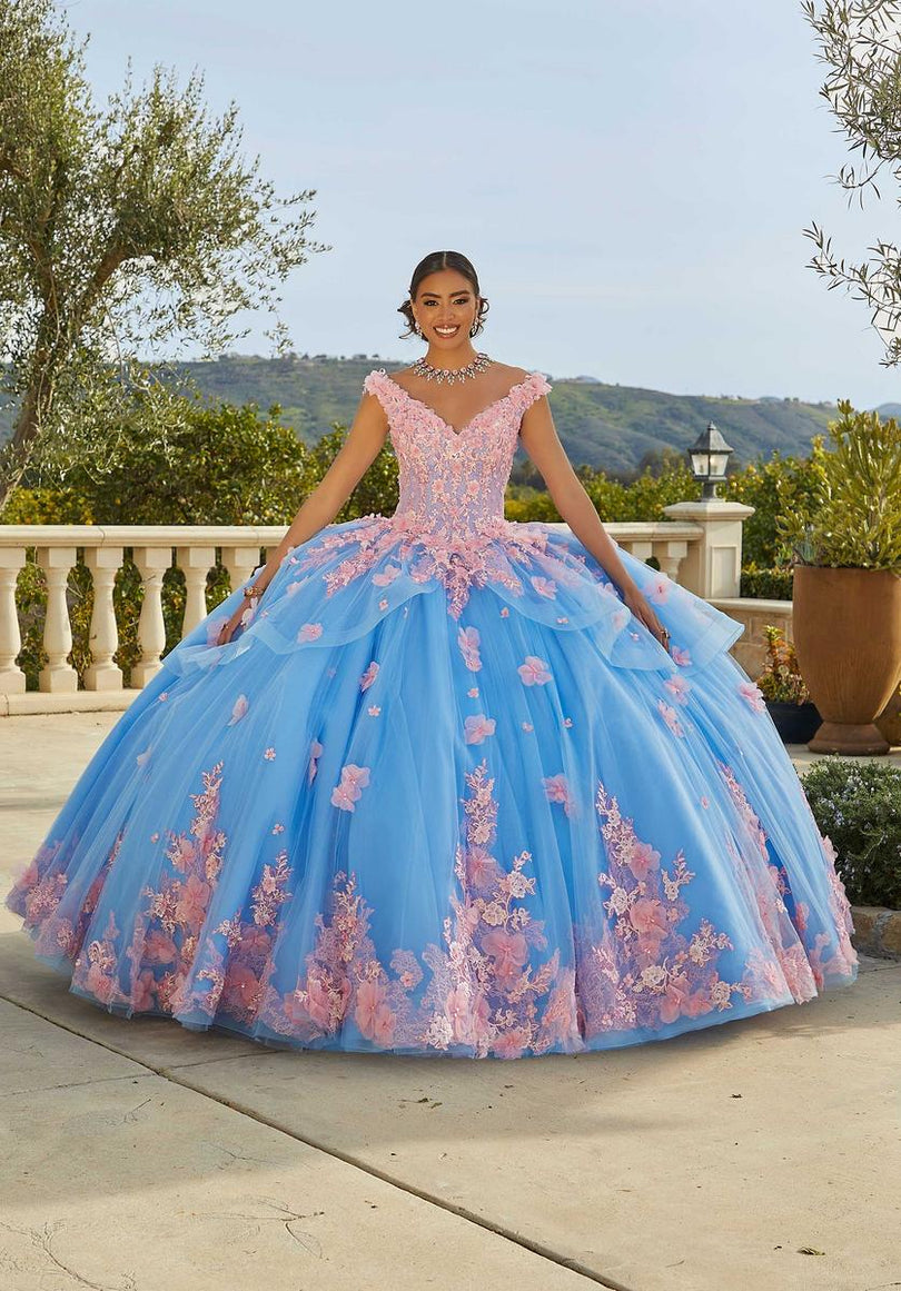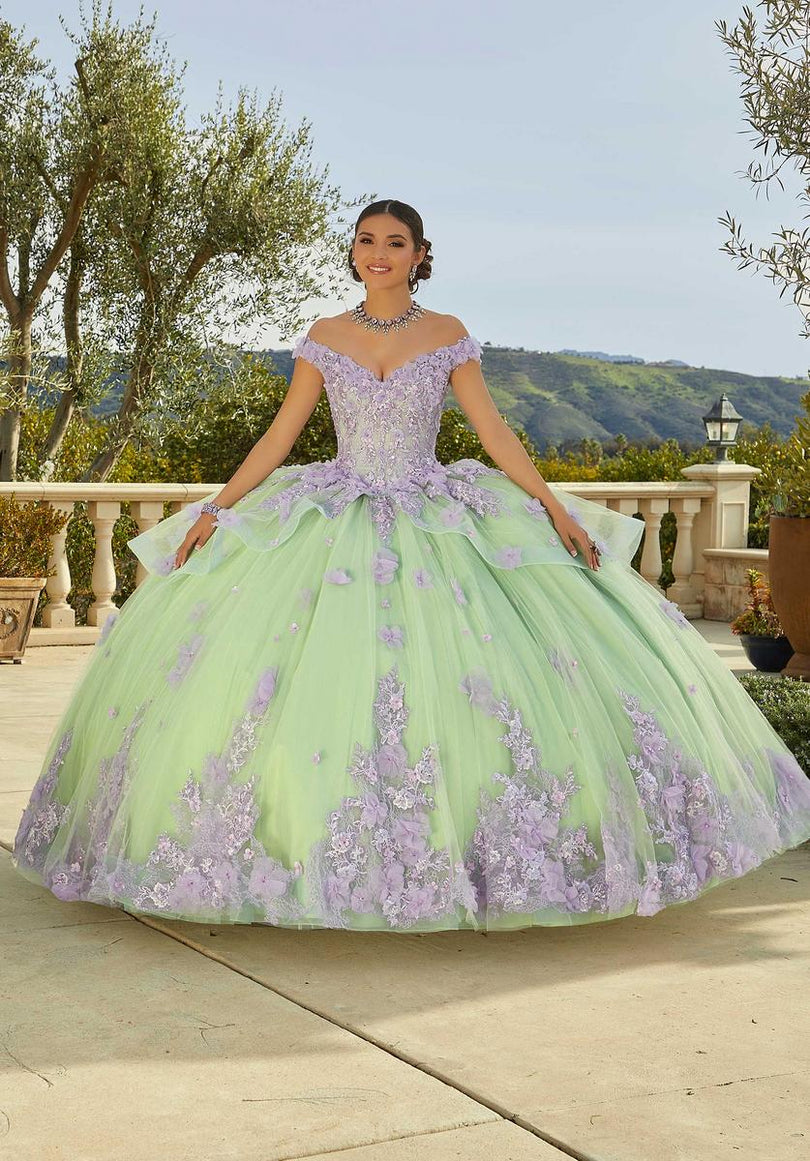 Step into a fairytale with this whimsical Vizcaya by Morilee quinceaera ball gown (style 89437). The timeless off-the-shoulder bodice, crafted from Chantilly lace, is a vision of elegance. Delicate crystal beads and three-dimensional floral appliqus dance across the bodice, creating a stunning contrast that captures the eye. These exquisite appliqus cascade gracefully down the flowing tulle skirt, leading to a beautifully embellished hemline border. The gown comes in a choice of enchanting color combinations: Sage/Lilac and French Blue/Pink, allowing you to find the perfect match for your dream quinceaera. A matching stole completes this unforgettable ensemble.