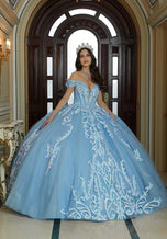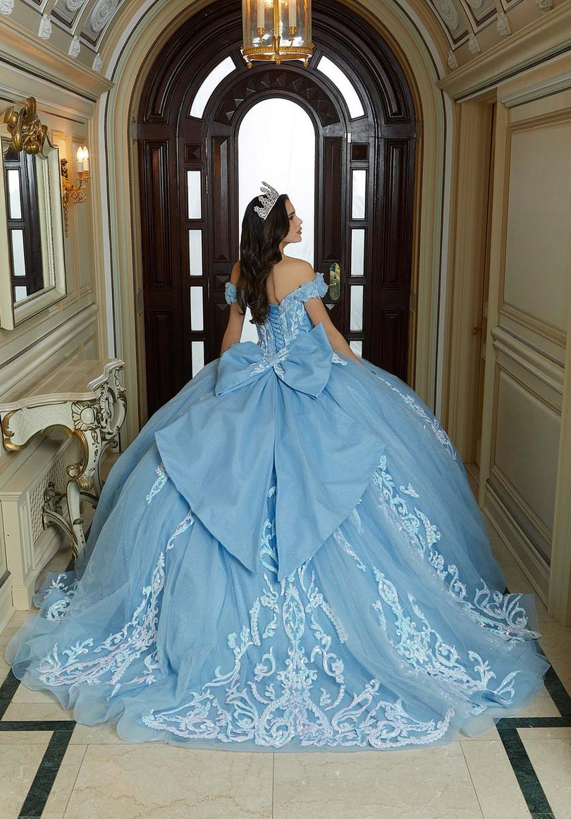 Receive all the compliments when you step into your venue on your special night! This Vizcaya quinceanera ballgown displays a plunged off-shoulder neckline with textured three-dimensional flowers with crystal beadwork. The sequin details start from top and flow onto the full glittering tulle skirt with detachable oversized bow detail on the back. Have an unforgettable night in this new Vizcaya Quince gown!