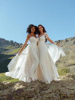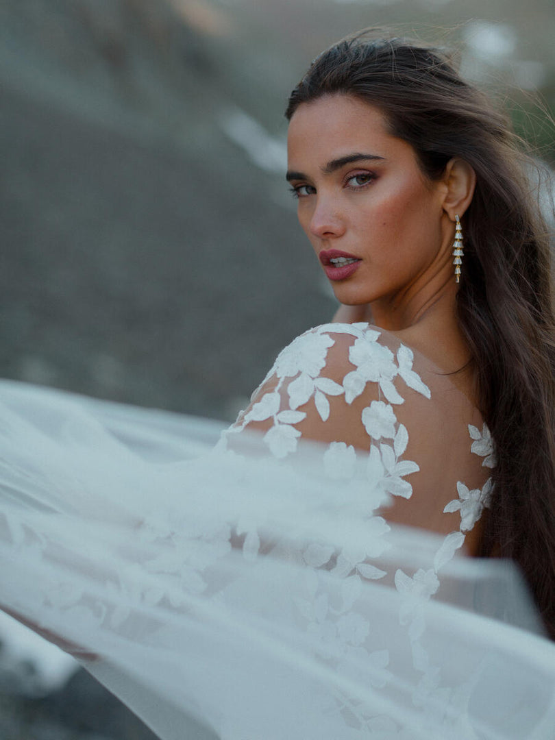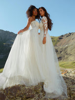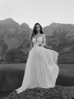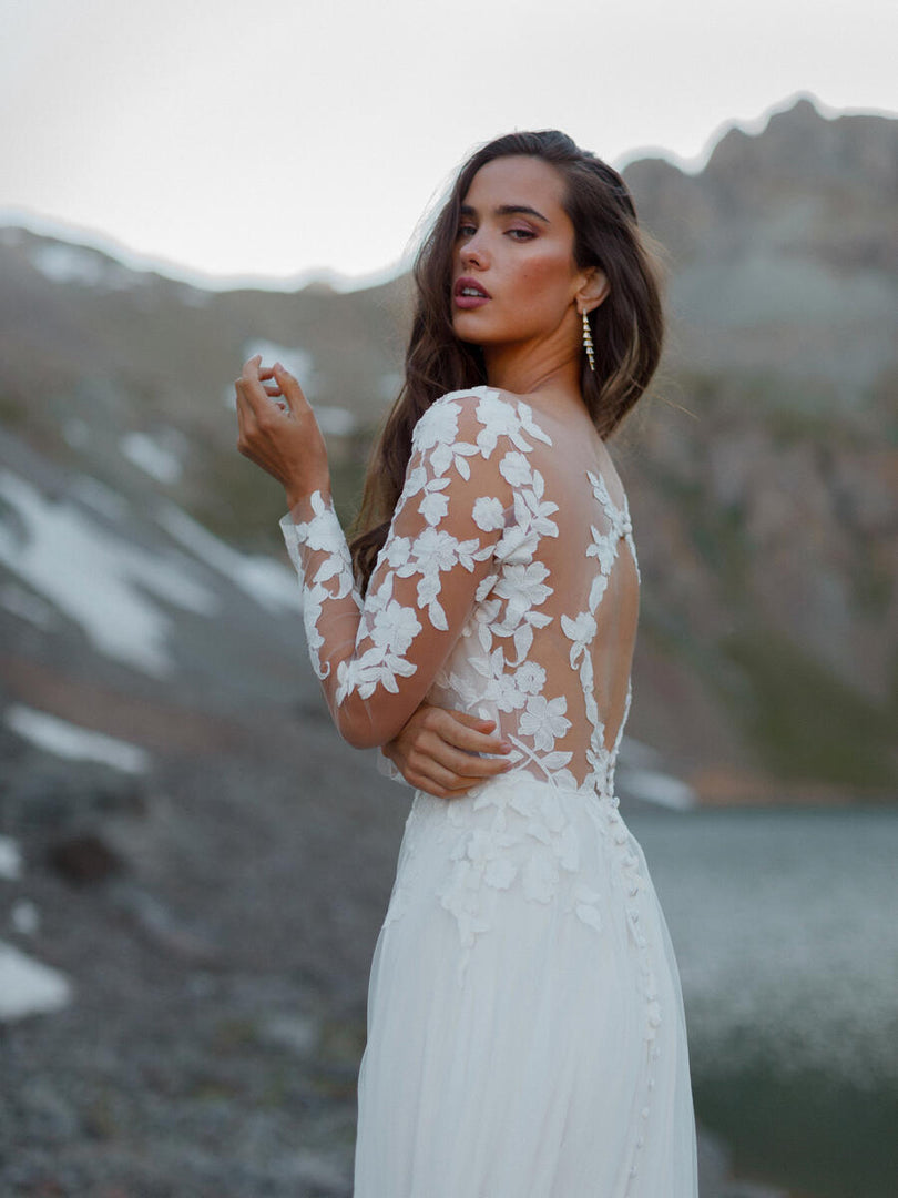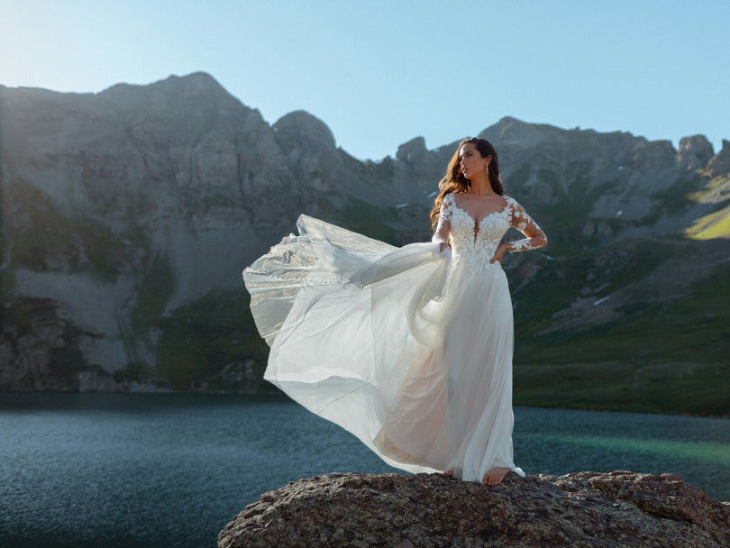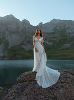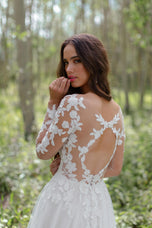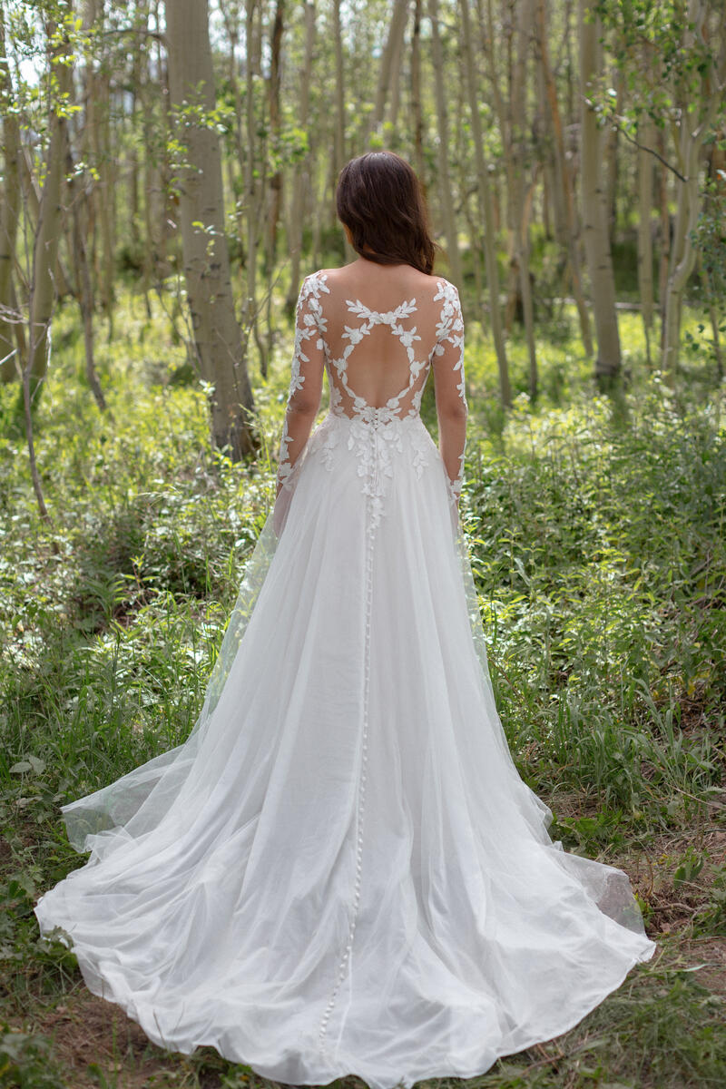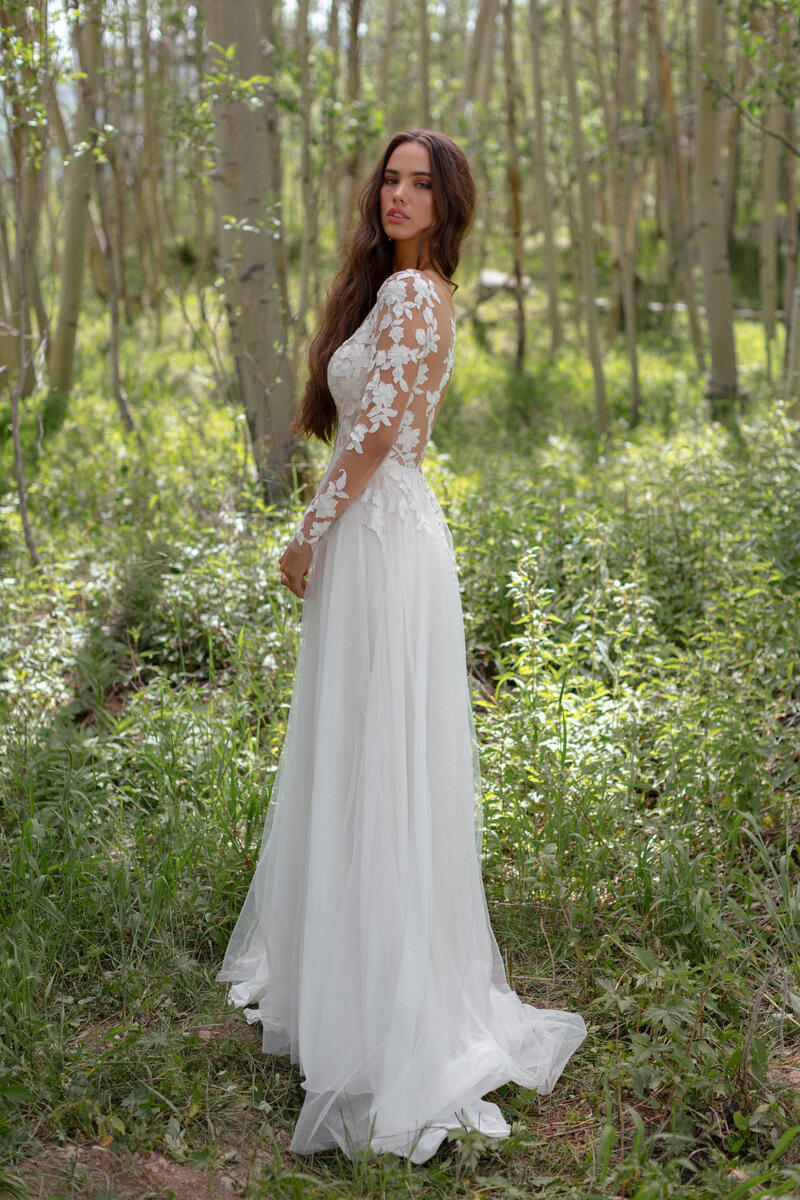 Lila is a stunning, boho-inspired bridal gown from the 2021 Wilderly Collection. Romantic lace leaves and flowers scatter across the illusion sleeves and bodice of this A-line gown, also featuring long sleeves and a sexy open keyhole back. Styled perfectly with your destination wedding or winter ceremony, we can't help but get boho-vibes from this daringly modern dress! Please call our Dallas, Texas location to check in-store availability, pricing and current ship dates.