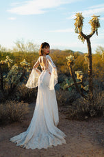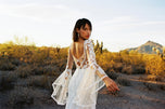 With a sheer butterfly back and ethereal illusion sleeves, Blair is a stunning boho-inspired addition to the Fall 2021 Wilderly bridal collection. Whether you've dreamed of a beach wedding or informal garden ceremony under the stars, this simple yet sweet fitted wedding dress will seamlessly accent your aisle style aesthetic. A plunging neckline and demurely sexy open back with keyhole detailing makes this classic yet modern bridal gown a must-see at your fitting! Please call our Dallas, Texas location to check in-store availability, pricing and current ship dates on this and other classic bridal looks!