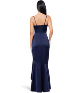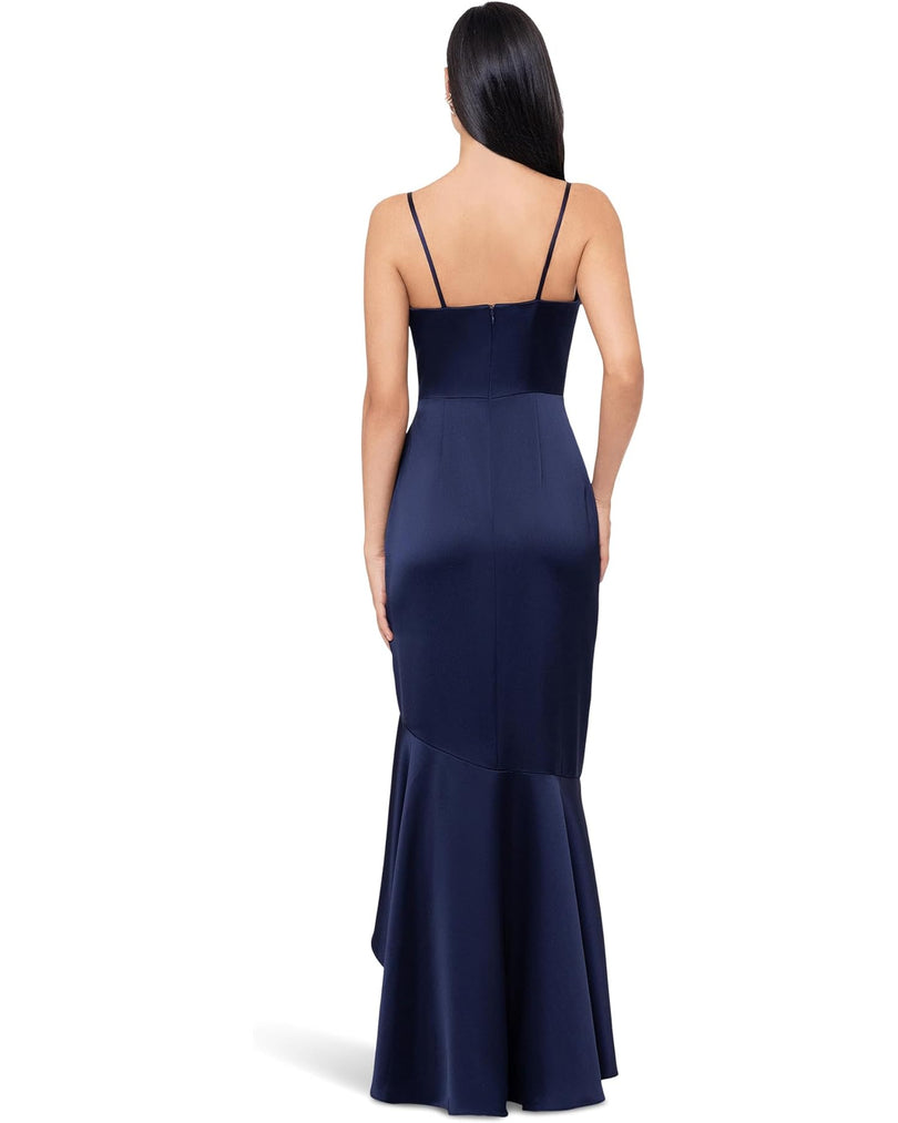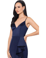 Sleek and simple yet effortlessly elegant is how you'll feel in Xscape 6251X! The v-neckline over empire waistline and sleek satin skirt with ruffle detail is the perfect dress for your next special occasion!
