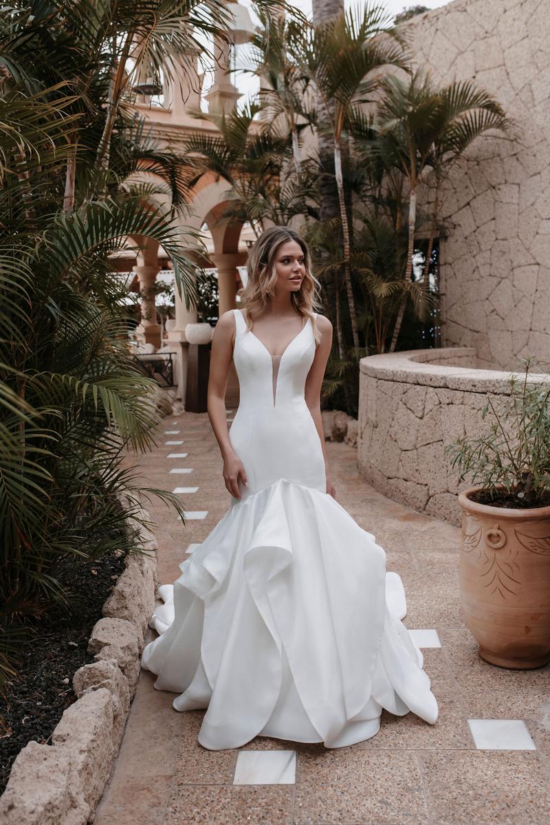 The perfect mix of classic and modern bridal gown design, this is Ursula from the Fall 2022 Abella collection. Tiered mikado ruffles compose the flared skirt of this pearlescent, statuesque gown, fit for a formal wedding or informal destination occasion. Featuring a plunging neckline and low v-back, you'll love your shape in this fit and flare beauty! Simple and chic but definitely fashion-forward, she's a must see! Please call our Dallas, Texas location to check in-store availability, pricing and current ship dates.