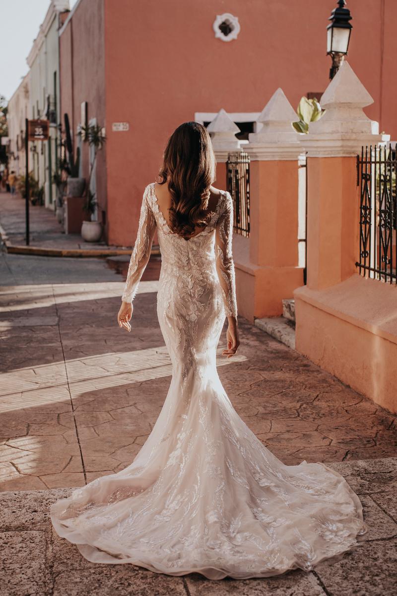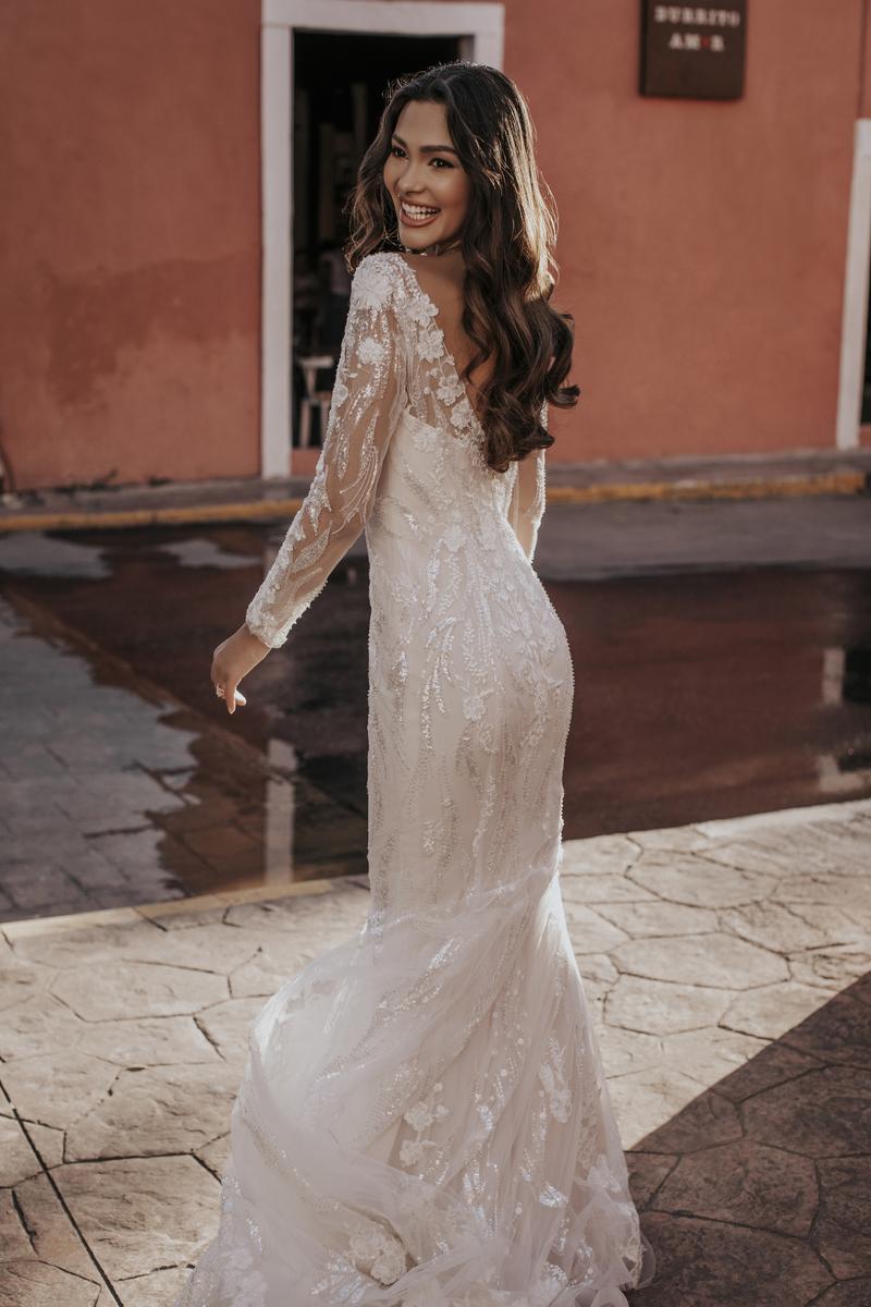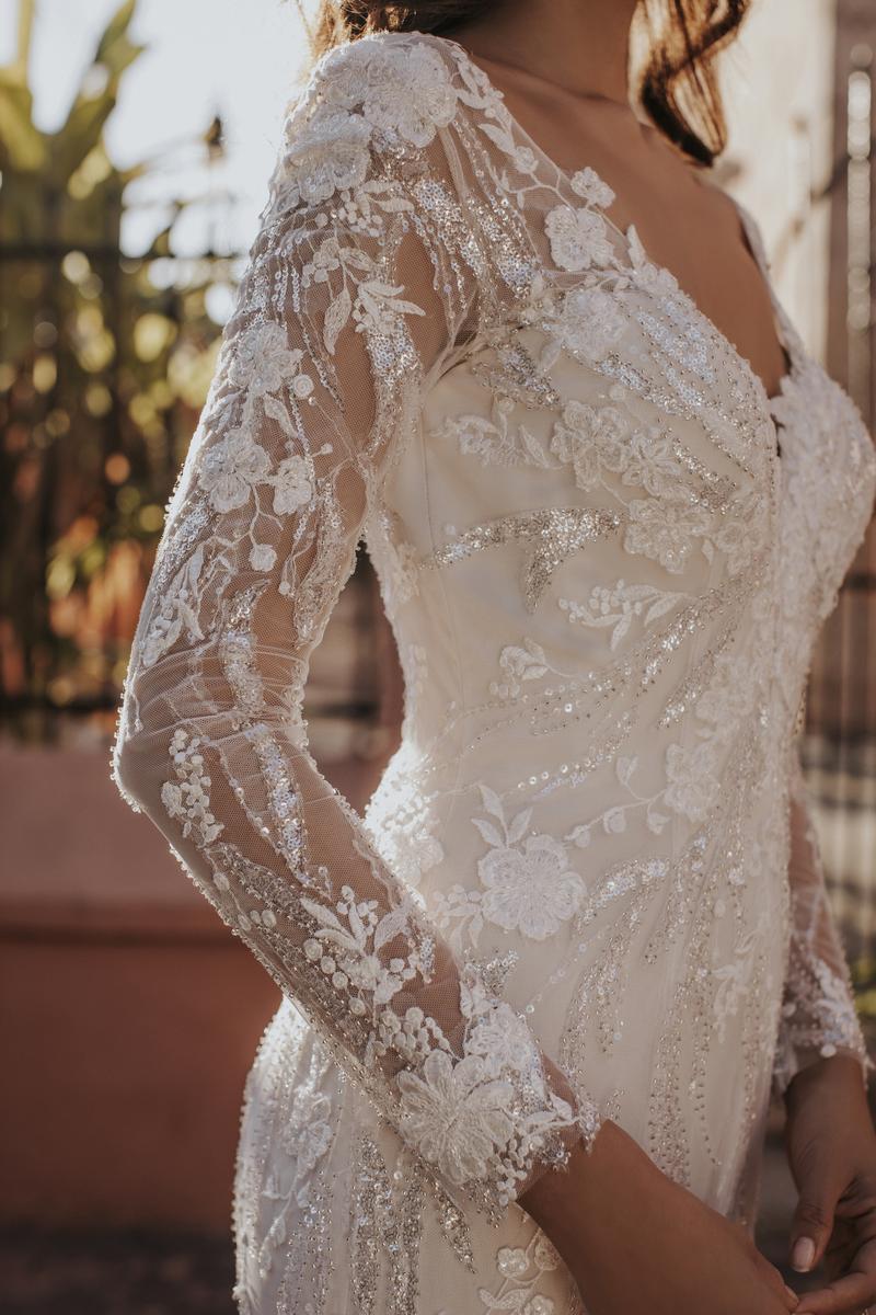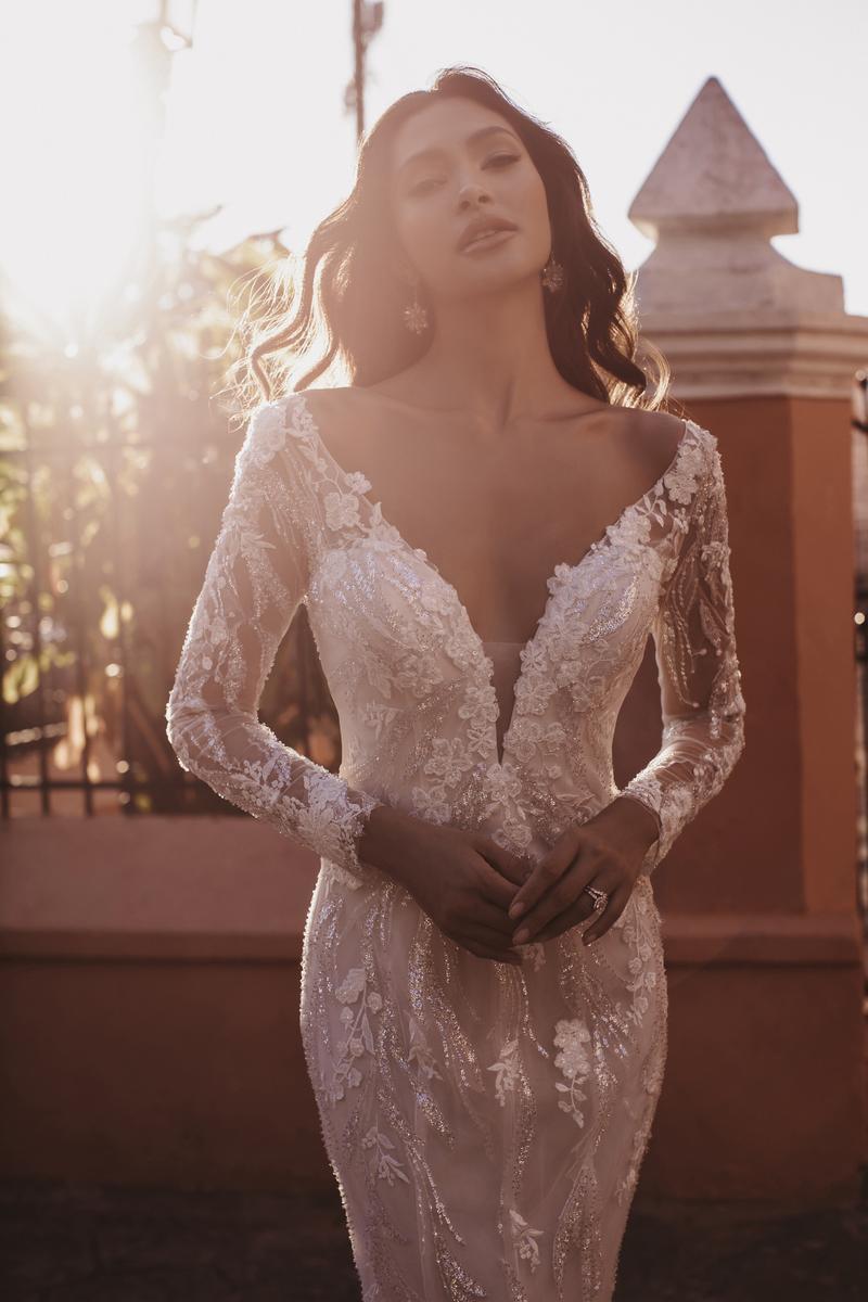 The long-sleeve elegant bridal vibe we've all been looking for, this is Olympia from the 2023 Abella Bridal Gown collection. Showcasing beauty and drama through her stunning sheath silhouette and deep neckline, Olympia is a dream pick for your formal wedding or winter-wonderland bridal setting. Please call our Dallas, Texas location to check in-store availability, pricing and current ship dates.