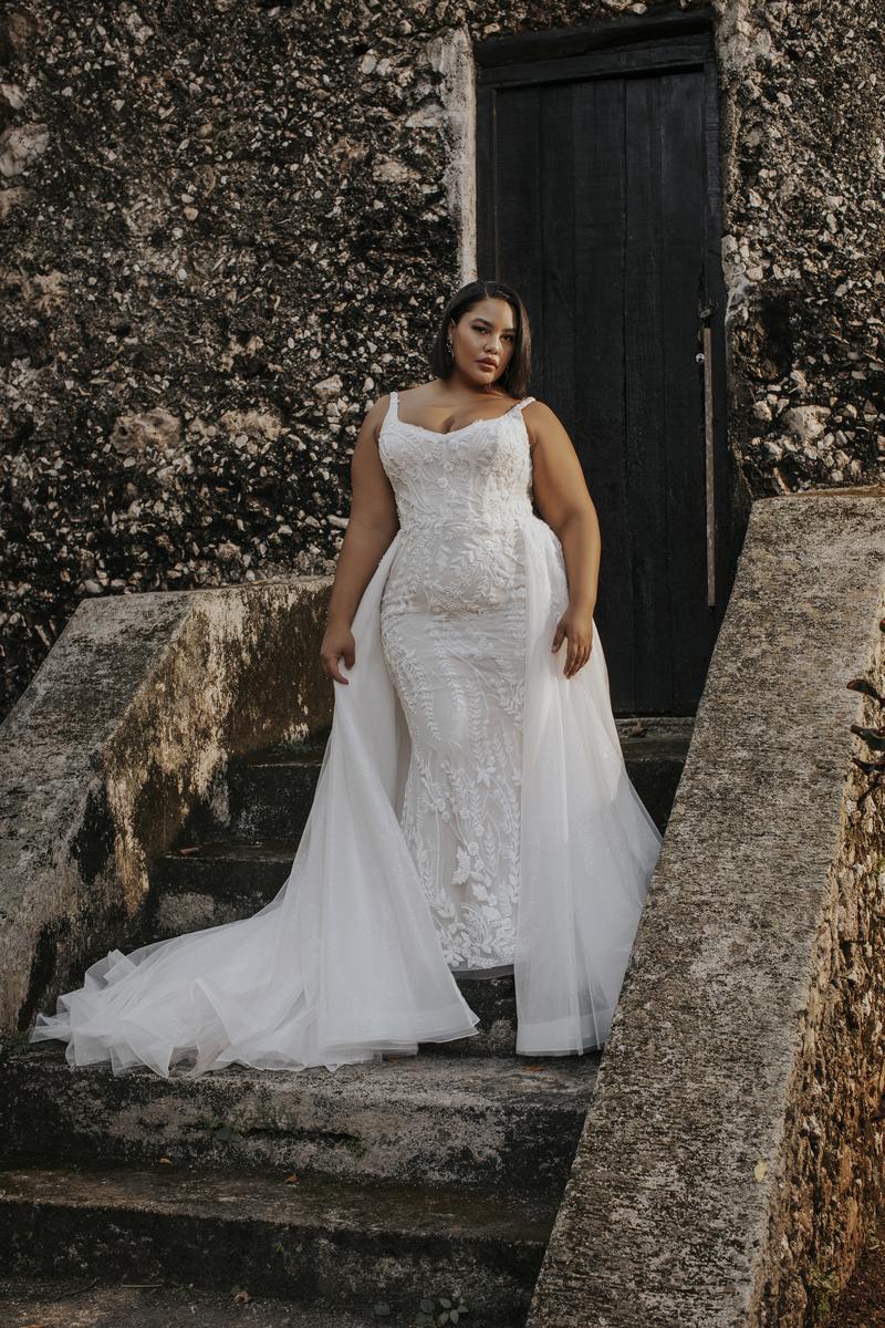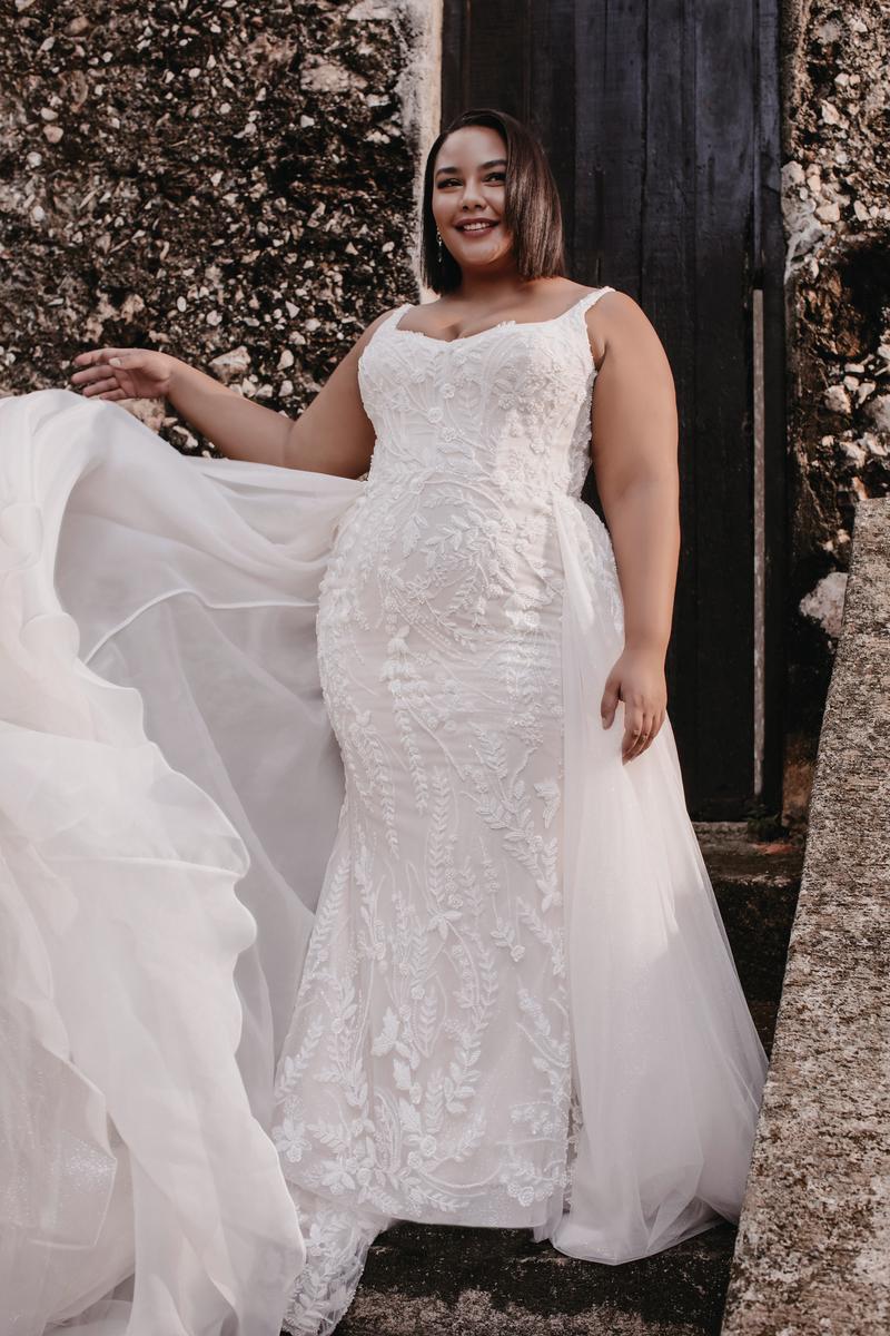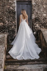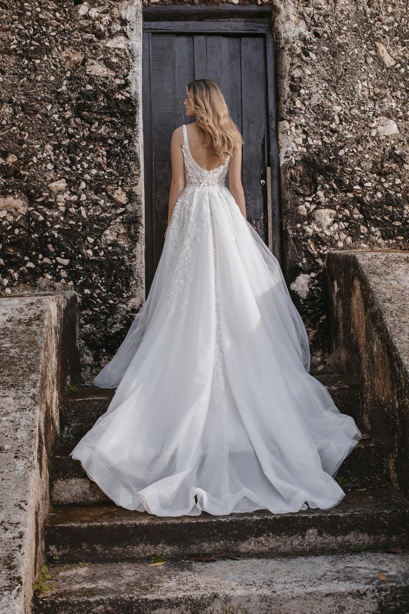 Euro-inspired for the fashion-forward bride, this is Sydney, featured in the Fall 2023 Abella Bridal Collection. Unique and chic, she features pearlescent beading and dreamy sequined lace appliques, along with a detachable tulle train, making her perfect for any bridal setting. Whether you're envisioning a destination wedding or a formal outdoor affair with all your besties, you'll love the way you feel in her modern styling, complete with a modified sweetheart neckline and square back. Please call our Dallas, Texas location to check in store availability, pricing, and for a ship date.