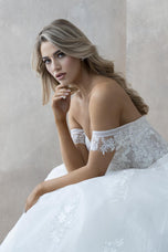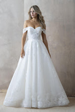 Whisk yourself away to a world of romance with the Abella by Allure E463 "Lorena" ballgown. This enchanting creation embodies pure romance with a touch of modern whimsy, making it a perfect choice for your fairytale wedding day.Shimmering Elegance: The dress features a flowing ballgown silhouette crafted from luxurious sparkle tulle. This fabric catches the light with every move, creating a captivating and glamorous effect. Delicate sequined lace appliques are meticulously scattered across the tulle, adding a touch of texture and dimension.Off-the-Shoulder Allure: The off-shoulder lace strap adds a touch of whimsy and romance. It frames your shoulders beautifully, creating a delicate and feminine look.Sweetheart Flattery: The sweetheart neckline flatters your dcolletage and draws the eye upwards to your face. This timeless silhouette is universally flattering and adds a touch of elegance to the overall design.Illusion Magic: A lace illusion bodice provides a touch of coverage and an air of mystery. This detail adds a subtle sensuality to the dress while ensuring you feel comfortable and confident all night long.The Abella by Allure E463 "Lorena" ballgown is a dream come true for the bride who desires a romantic and unforgettable wedding look. The combination of shimmering tulle, delicate lace, and a flattering silhouette creates a gown that is both elegant and breathtaking.