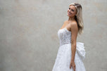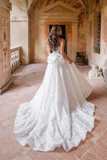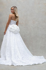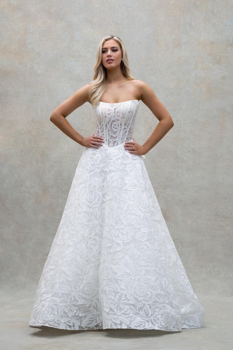 The Abella by Allure Bridals Spring 2025 Dea wedding gown, style E518L, is a vintage-inspired masterpiece that exudes romance and elegance. The stunning floral lace appliqus beautifully accent the gown, while a graceful flounce adds movement and charm. The strapless neckline and Basque waist enhance the gown's delicate silhouette, creating a flattering and ethereal look. With its romantic square neckline, Dea offers a unique and chic design, perfect for the bride who loves a blend of classic vintage with a modern, sophisticated twist.