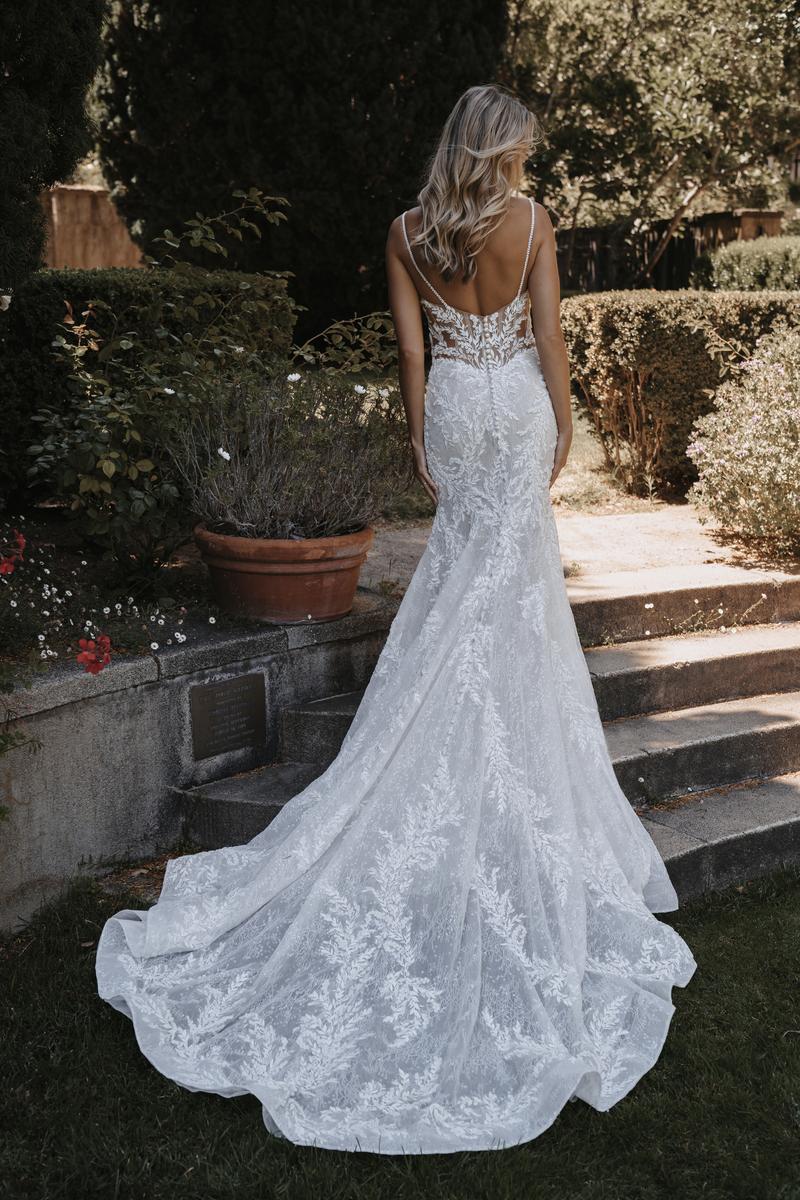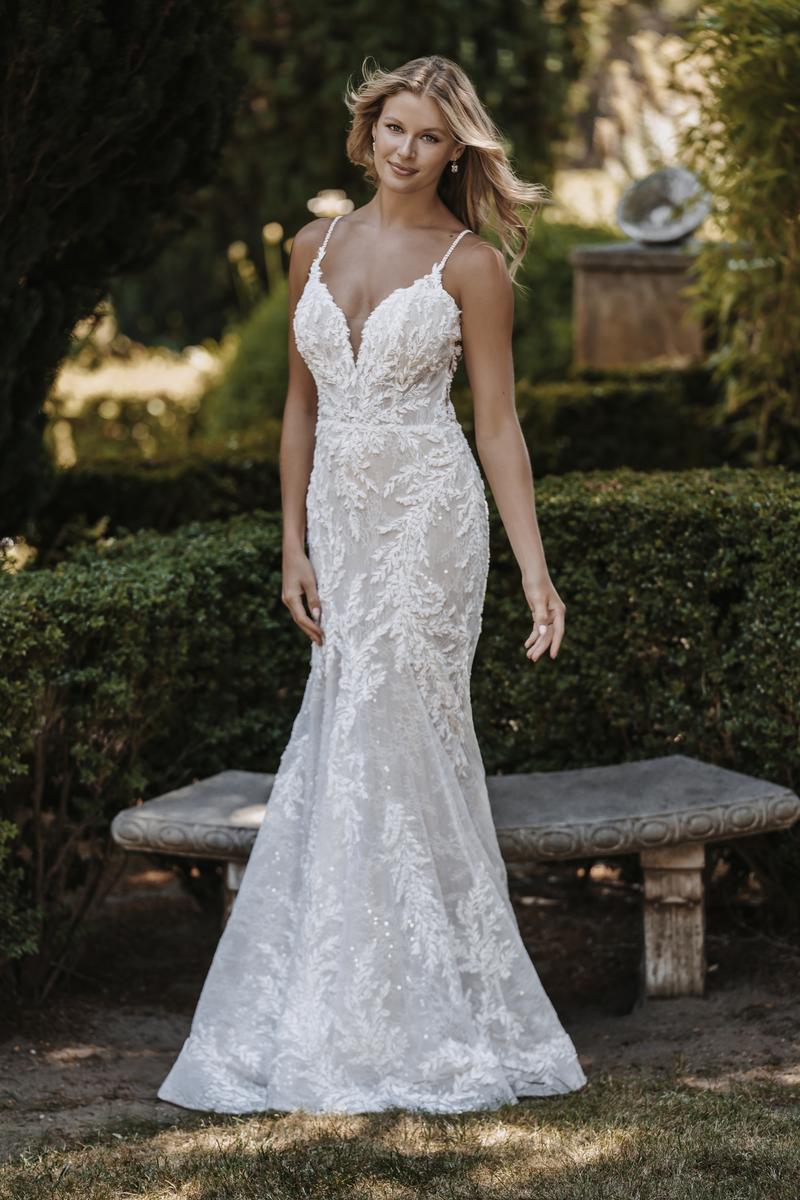 A demurely sexy sheath as romantic as your love, this is style C641 from Allure's Spring 2022 Couture collection. We're absolutely obsessed the multi-layered look of this lace, fitted wedding dress, ready to steal the show at your formal wedding or chic, modern ceremony. Woodsy, lace appliqus adorn the look on this illusion bodice, complete with delicate, beaded straps. Delicate threading adorns the overlay of this wedding dress and we can't wait to see it shimmer and shine at your outdoor ceremony. Also available 4" shorter for our petite brides, making alterations a breeze! For other fantastic couture bridal gown options and more info, please call our Dallas, Texas location to check in-store availability, pricing and current ship dates.