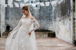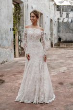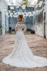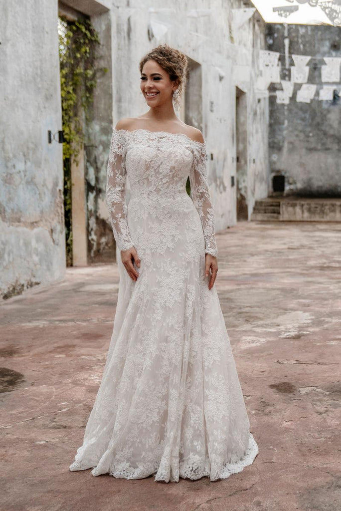 Proof that modest or demure need not be boring, this is C658 from Allure Couture's Fall 2022 Bridal Gown collection. A formal and fitted a-line wedding dress begging to take center stage at your winter wedding or Megan Markel-inspired fete, she's edged in a scalloped off-shoulder neckline, seemlessly blending tradition with modern bridal design detailing. Long illusion laced sleeves and an illusion back complete the look. Please call our Dallas, Texas location to check in-store availability, pricing and current ship dates.