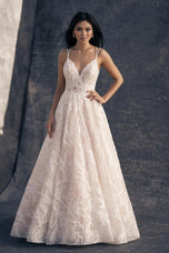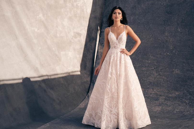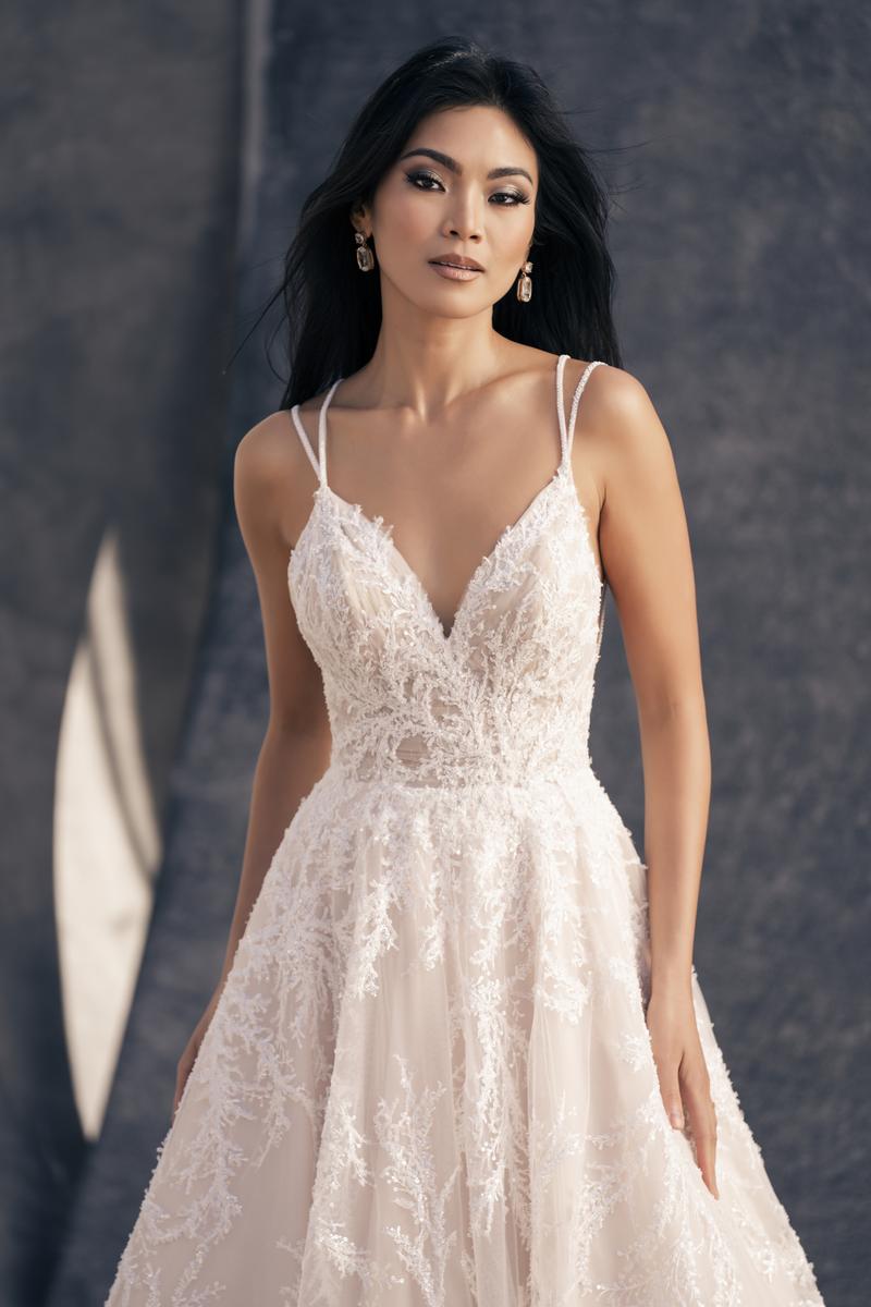 A fabulous boho-dream dress with just a touch of drama, this is C708 from Allure Couture's fall 2023 Bridal Gown collection. Dual beaded straps and ethereally beaded lace appliques add stunning dimension and texture to this A-line gown, finished with a gorgeous leafy beaded detail throughout the gown. We're imagining this look for your destination wedding in the woods or a garden reception fit for a whimsical boho-bride! Please call our Dallas, Texas location to check in-store availability, pricing and current ship dates.