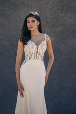 Style C723 from Allure Couture's Spring 2024 bridal gown collection is a gorgeous style featuring modern details on a classic silhouette. Demurely sexy, we're loving the illusion bodice and ultra-romantic illusion train. High-contrast bead and pearl lace appliques provide the perfect contrast to this sleek, modern crepe sheath that will keep all eyes on you! Also available lined for a more modest bridal gown feel.