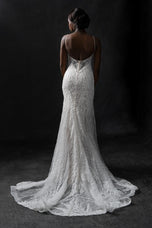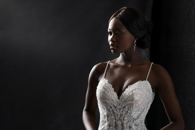 The Allure Couture Spring 2025 bridal gown, style C763, channels the glamour of the Roaring Twenties with opulent sophistication. This stunning sheath gown is adorned with intricate beadwork, blending sparkling crystals, shimmering sequins, and luminous pearls for a look that radiates luxury. Its sleek silhouette offers a demurely sexy appeal, combining vintage charm with chic modernity. Perfect for the bride seeking a timeless yet fashion-forward design, this gown is a dazzling choice for a truly unforgettable wedding day.