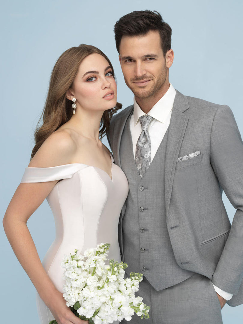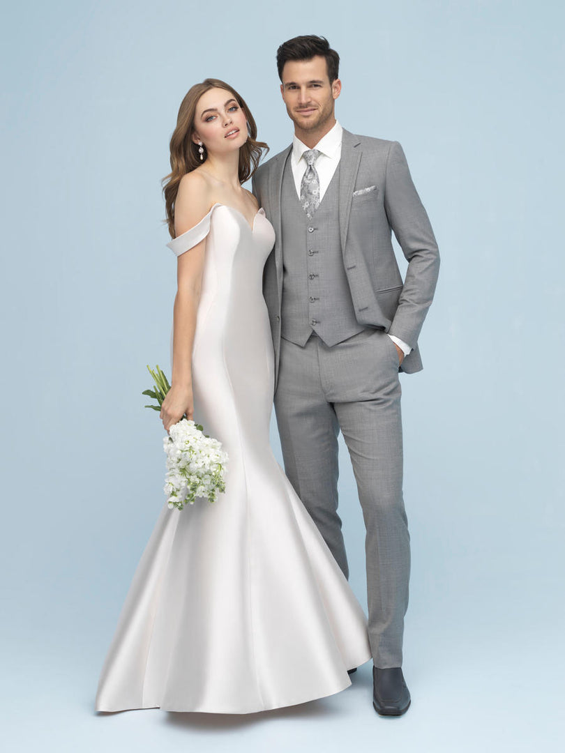 This elegant yet simple gown by Allure Bridals is style 9608 from their Spring 2019 collection. This fit and flare look will allow you to show off your figure on your wedding day at your formal church wedding or modern destination wedding. This structured mermaid gown features draped off-shoulder straps and a sweetheart neckline. The back has covered buttons going down to the hemline of the chapel train. The mikado fabric adds a unique sheen that will help you to shine as you walk down the aisle. Please call our Dallas, Texas location to check in-store availability, pricing and current ship dates.
