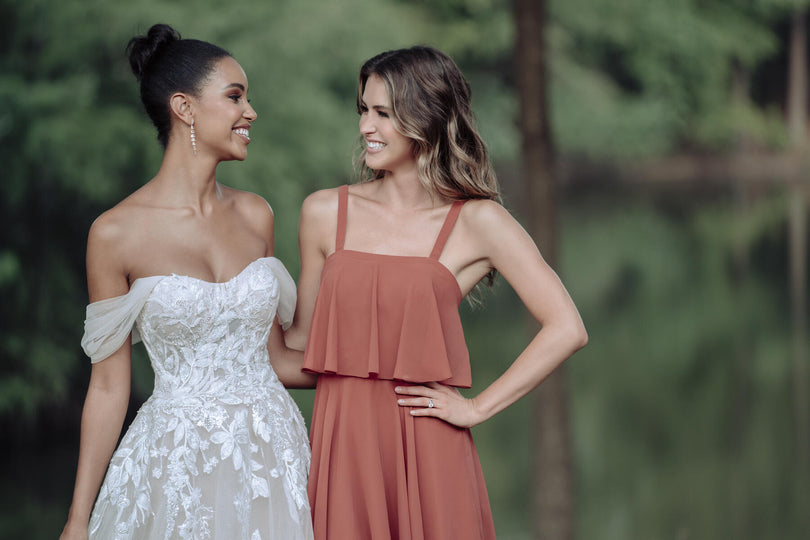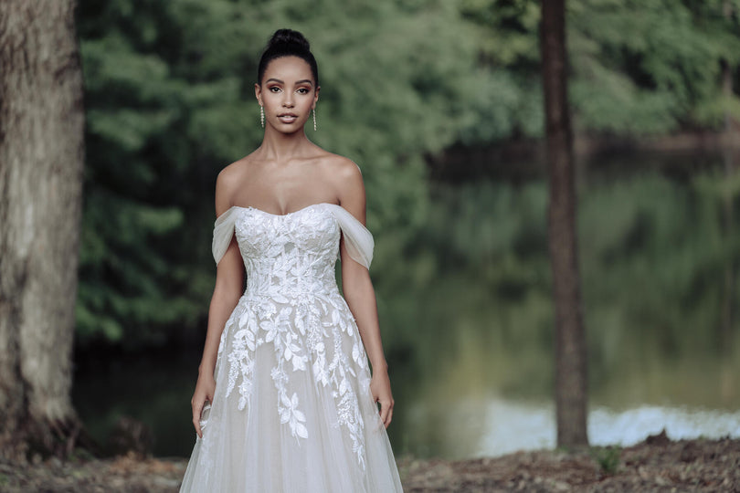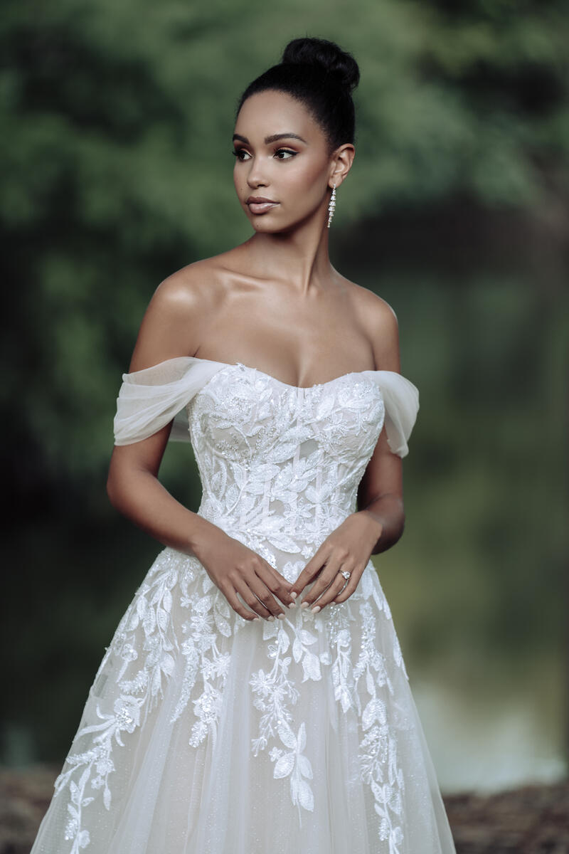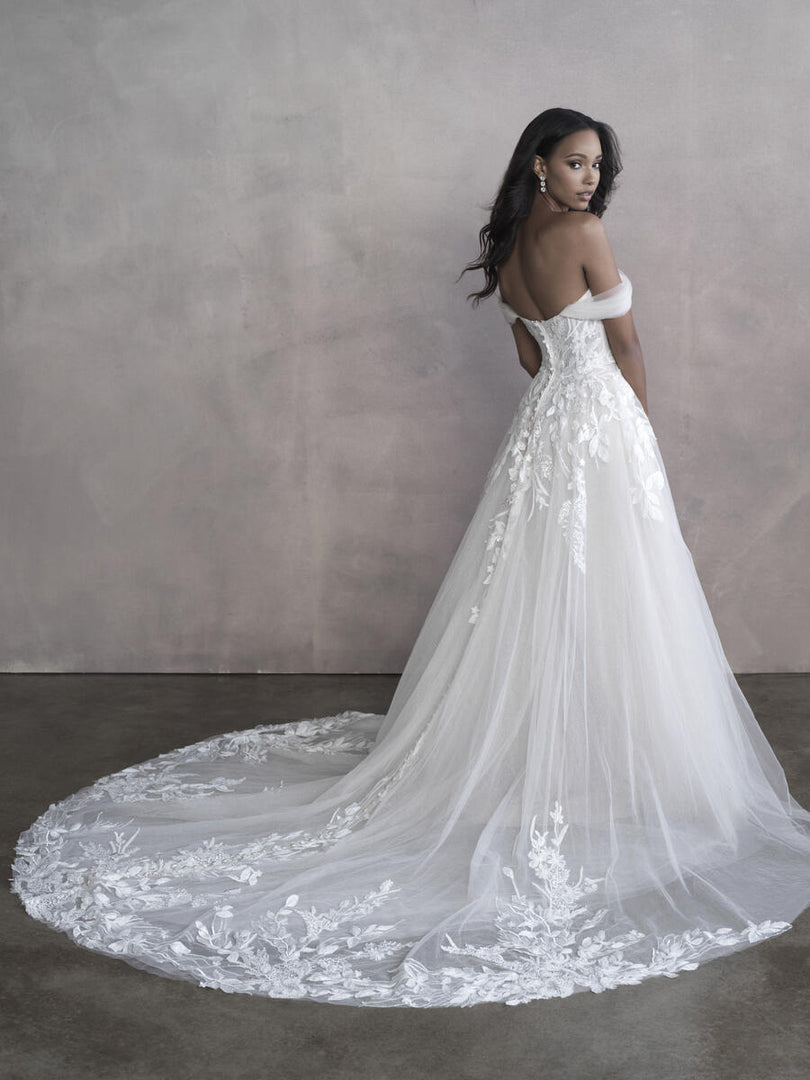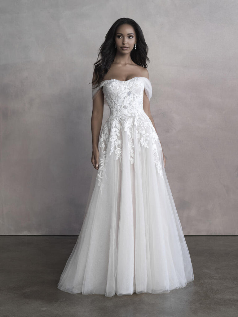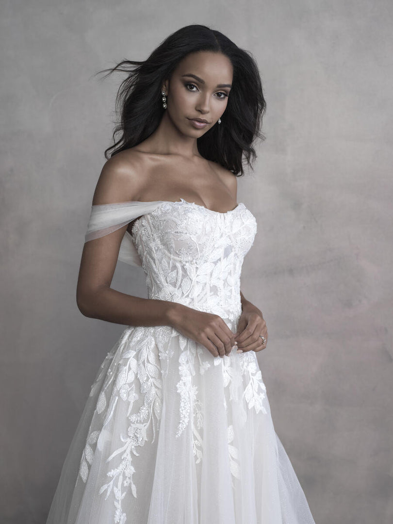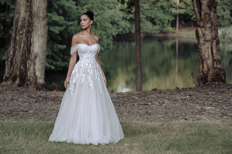 Soft and romantic, this ethereal off-shoulder gown is a truly timeless addition to Allure Bridal's 2021 Bridal Gown collection. A demure and modest look for your outdoor ceremony or formal church ceremony, this a-line bridal gown has all your favorite bridal elements: a strapless neckline impeccably fit to dance the night away under the stars, a soft tulle skirt for floating down the aisle and boho-inspired lace appliques for your vintage themed destination wedding! Also available with a lined bodice as style 9803 for a more modest bridal gown look. Please call our Dallas, Texas location to check in-store availability, pricing and current ship dates.
