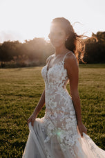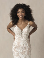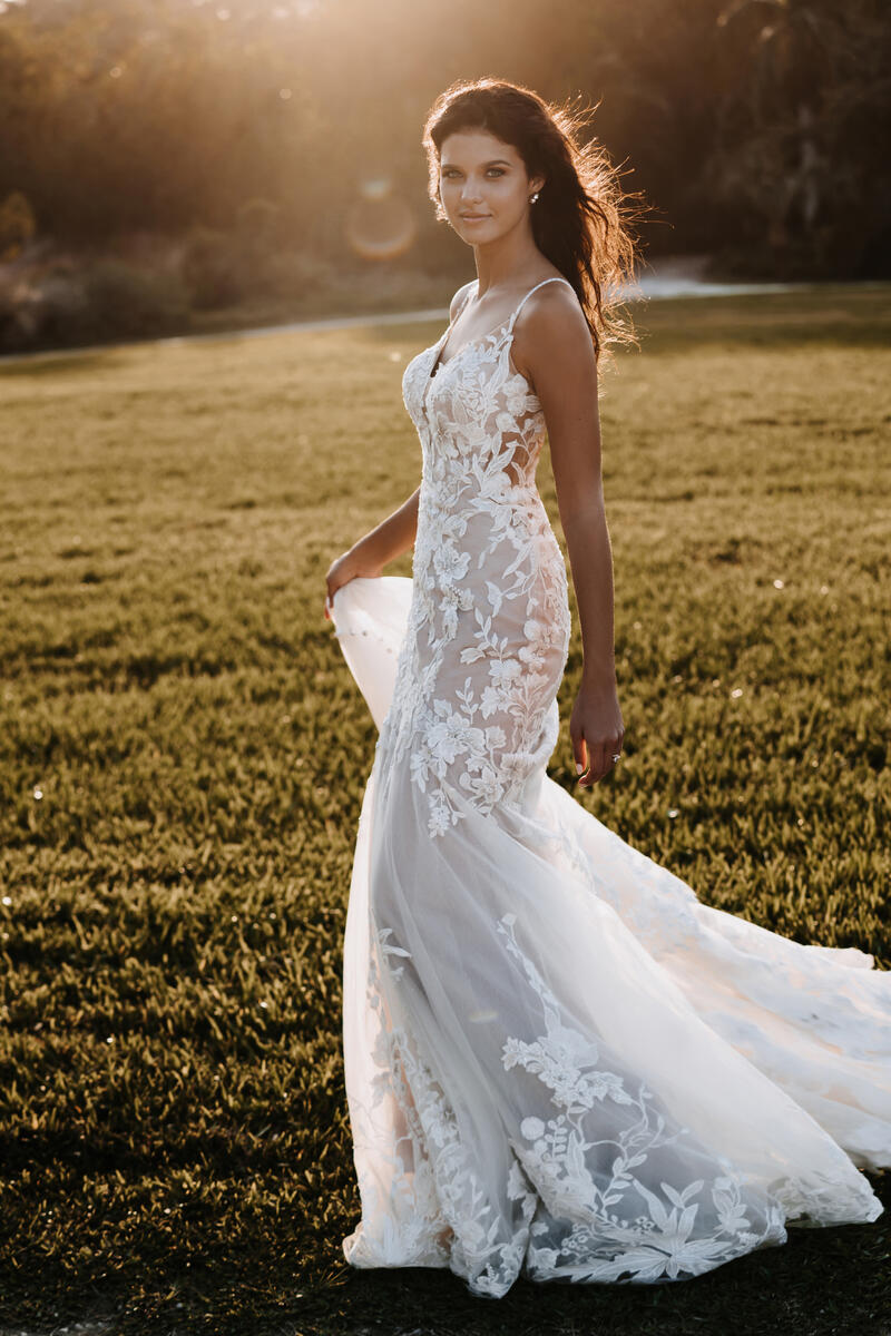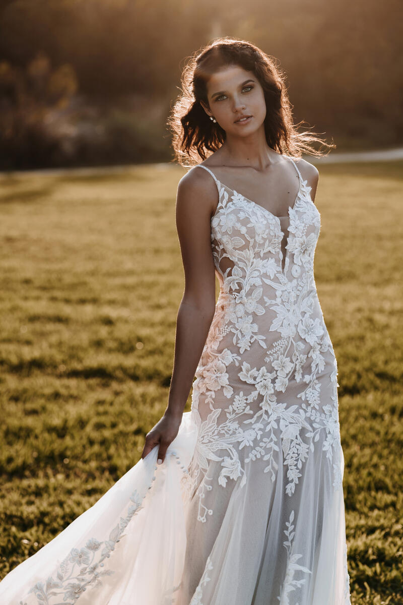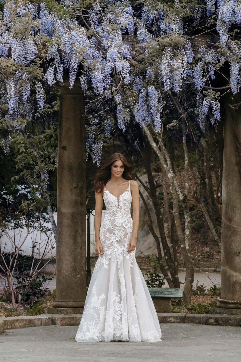 Delicate and subtle, this appliqued sheath wedding dress is style 9851 from Allure Bridal's Fall 2021 Wedding Dress! Featuring a low back and a slight fit and flare silhouette, we're obsessed with the vintage-inspired lace appliques--a perfect addition to your romantic ceremony under the stars or destination location! Also fit for your formal ceremony, you'll simply float down the aisle in such a timeless bridal gown! Please call our Dallas, Texas location to check in-store availability, pricing and current ship dates.