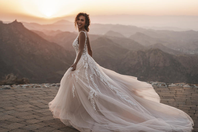 The Allure Bridals A1203 gown is a masterpiece that seamlessly blends drama, elegance, and romance. The bodice and full tulle skirt are adorned with leaves crafted from intricate beading and sequined lace, creating a stunning and ethereal effect. The sleeveless design and plunging neckline add a touch of allure and sophistication, making it a flattering choice for the modern bride. Whether against the backdrop of a romantic outdoor setting or a formal reception in a garden, this gown exudes versatility, ensuring the bride looks gorgeous and dramatic in any setting. With its captivating details and enchanting aesthetic, this Allure Bridals creation is a perfect choice for a bride who wants to make a memorable and stylish statement on her wedding day.