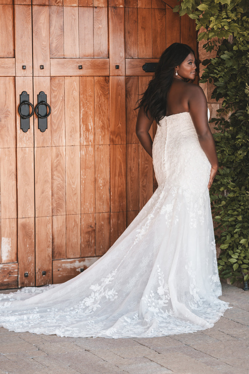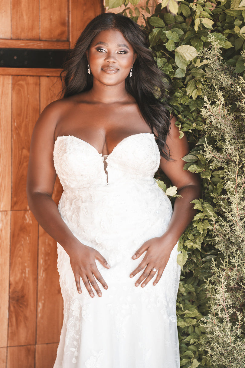 Chic exposed boning along the bodice accent the sequined and beaded lace appliques and Chantilly lace backdrop of this sheath style bridal gown. Pictured with sleeve A1210SL, sold separately. Available both unlined for a more sultry look, or lined to the zipper for the more modest bride.
