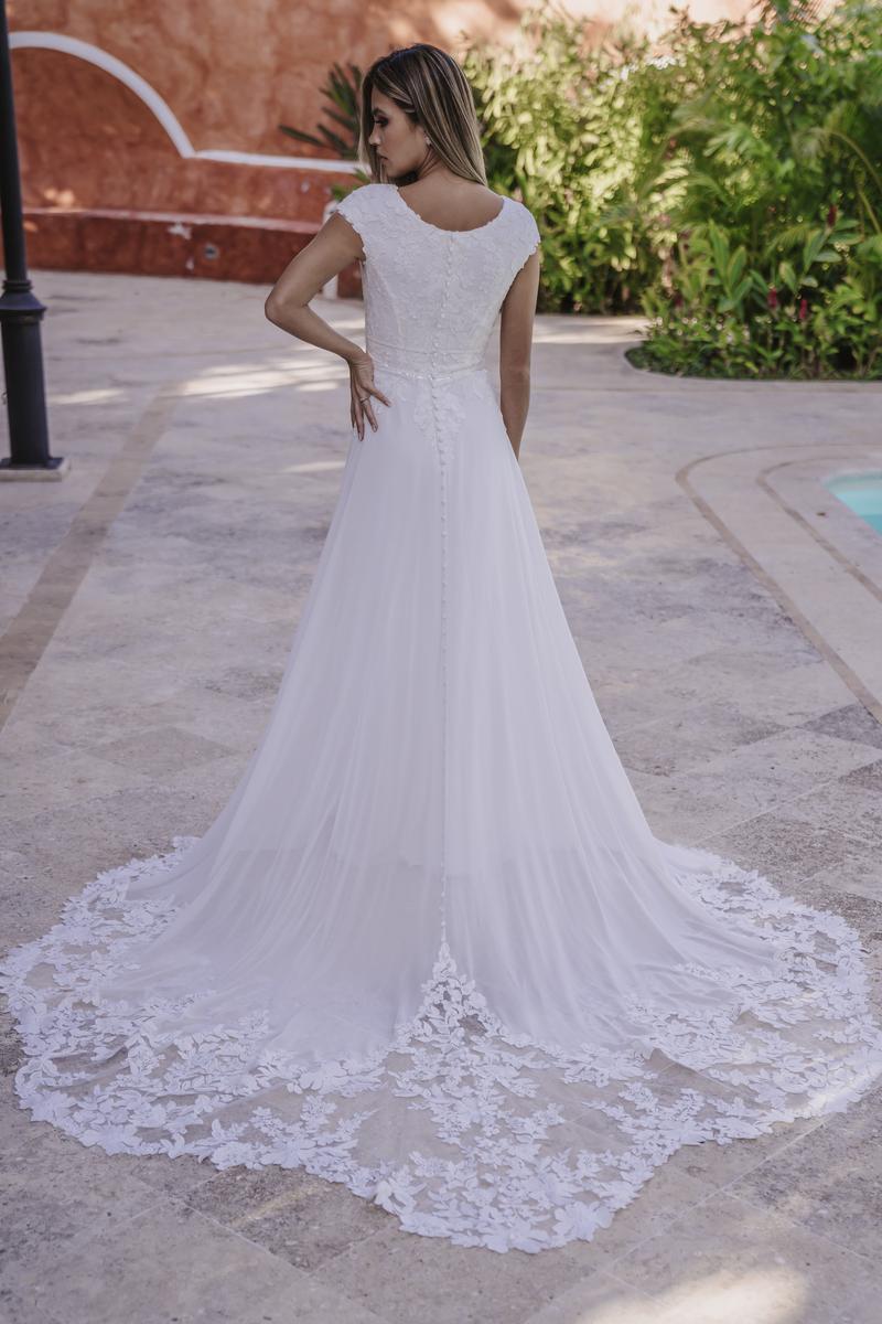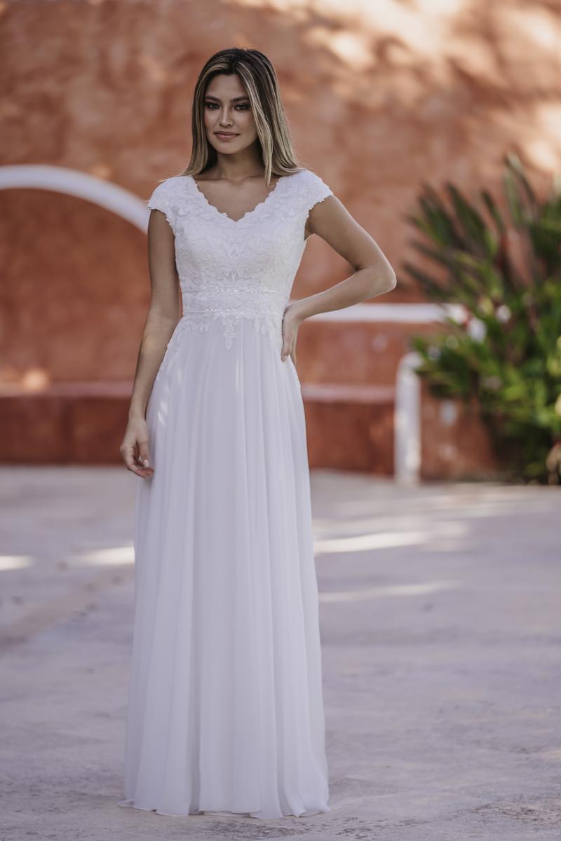 Have everyone teary eyed when you make your grand entrance in this breathtaking aline bridal gown designed by Allure Modest Bridal. M692, is created with a modest v-neckline with scalloped trim and cap sleeves. The slim fitting bodice is beautifully adorned in floral lace and thin beaded belt that will accentuate your waistline. The flowy chiffon skirt that will sway with every step that you take! This is the one for you to showcase on your special day!